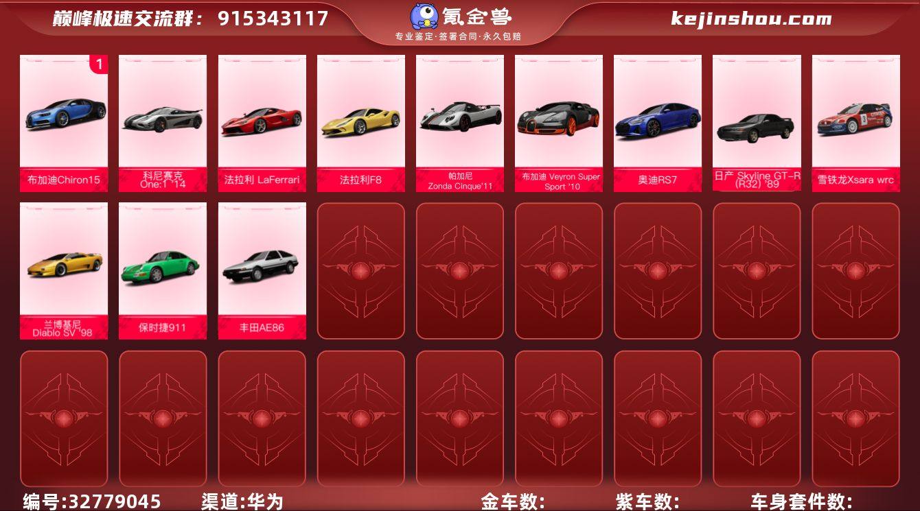 0阶日产 Skyline GT-R (R32) '89,0阶雪铁龙 Xsara WRC '04,0阶兰博基尼 Diablo SV '98,0阶保时捷911,0阶丰田AE86 0阶帕加尼Zonda Cinque'11,0阶布加迪 Veyron Super Sport '10,0阶奥迪RS7 1阶布加迪Chiron15,0阶科尼赛克 One:1 '14,0阶法拉利LaFerrari `14,0阶法拉利F8 卖家说:喜欢的人拍下就行