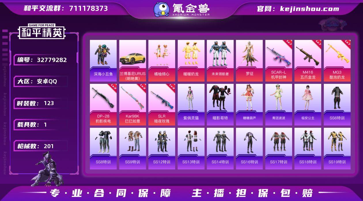 【943341】安卓 手Q-5粉装-6特效枪-1载具-0粉色飞行器-62453热力值-2王牌印记-123套装-201枪皮 【热门品类】:套装-深海小丑鱼,套装-暗影哥特 【粉色套装】:粉装-橘柚倾心,粉装-暖暖奶龙,粉装-未来领航者,角色-罗征,角色-虎痴许褚 【粉色枪皮等级】:SCAR-L-机甲封神(七级),M416-五爪金龙(七级),Kar98K-巳巳如意(三级),SLR-暗夜玫瑰(三级),DP-28-豹影疾电(三级),MG3-酷泡奶龙(七级) 【粉色载具】:兰博基尼URUS(明艳黄) 【粉色枪皮】:SCAR-L-机甲封神,M416-五爪金龙,Kar98K-巳巳如意,SLR-暗夜玫瑰,DP-28-豹影疾电,MG3-酷泡奶龙 【粉色降落伞】:绝对恒星降落伞,梦幻火箭降落伞,甜蜜誓约降落伞,四圣焕新降落伞,葫芦兄弟降落伞,蓝莓炮弹降落伞 【稀有套装】:套装-雪国风尚,套装-马上有钱,套装-糖糖葫芦,套装-青团波波,角色-临安公主,角色-紫俏灵猫,角色-孙斩天 【稀有枪皮】:AKM-彩虹符号,AKM-灼热熔岩,AKM-王牌投手,AKM-破晓战魂,AKM-筑梦精灵,AKM-萌趣颜团子,AKM-虎虎生威,M16A4-幻世战舞者,M16A4-甜心亚梦,M16A4-红色方程式,SCAR-L-炫彩节奏,SCAR-L-红色方程式,M416-夜灯,M416-糯团青竹,M416-红色方程式,M416-蓝色火焰,GROZ...