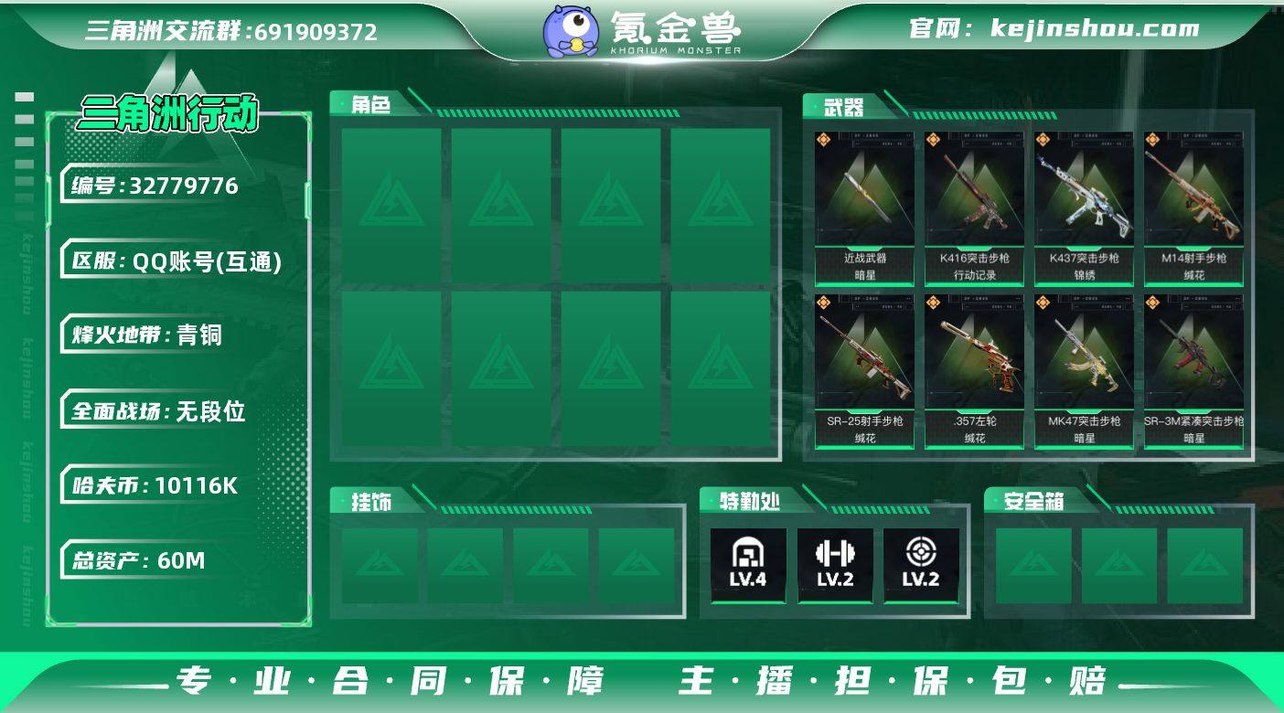 【SJZX1844】总资产(M):60M/哈夫币(K):10116K/哈夫币(K):10116K/传说枪皮数:8/全面战场等级:1_段位:无段位/烽火地带等级:37_段位:青铜/近战-暗星/近战-黑鹰/K416突击步枪-行动记录/K437突击步枪-锦绣/MK47突击步枪-暗星/SR-3M紧凑突击步枪-暗星/M14射手步枪-蛮荒/M14射手步枪-缄花/SR-25射手步枪-缄花/.357左轮-缄花/Vector冲锋枪-阿萨拉文明/MP7冲锋枪-六套之力/M249轻机枪-丛林谍踪/VSS射手步枪-丛林谍踪/M14射手步枪-航天庆典/野牛冲锋枪-千里骏骨/SG552突击步枪-马年新春/G3战斗步枪-猛禽/CAR-15突击步枪-来财/Vector冲锋枪-先锋/SMG-45冲锋枪-行动开启/SR-3M紧凑突击步枪-马年新春/QJB201轻机枪-哈夫克卫队/SR-25射手步枪-开拓/QSZ92G-一帆风顺/M4A1突击步枪-高雅黑/M4A1突击步枪-海色/QBZ95-1突击步枪-海色/K416突击步枪-几何迷彩/K416突击步枪-重击/SG552突击步枪-海浪/SG552突击步枪-狂欢/PTR-32突击步枪-典雅/CAR-15突击步枪-狂欢/AS Val突击步枪-黑巧甜心/P90冲锋枪-黑巧甜心/UZI冲锋枪-海色/UZI冲锋枪-狂欢/野牛冲锋枪-高雅黑/SR-3M紧凑突击步枪-三角洲力量/M1014霰弹枪-海浪/M249轻机枪-黄蜂/QJB201轻机枪-典雅/SVD狙击步枪-重击/SV-98狙击步枪-典雅/沙漠...