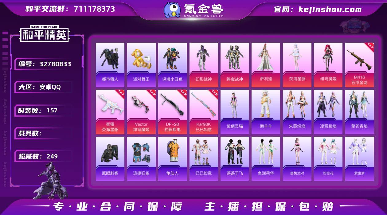 安卓 手Q-5粉装-8特效枪-0载具-2粉色飞行器-70534热力值-12王牌印记-157套装-249枪皮 【热门品类】:套装-都市猎人,套装-派对舞王,套装-深海小丑鱼,套装-龟仙人 【粉色套装】:粉装-幻影战神,粉装-绚金战神,角色-萨利娅,角色-荧海星豚,角色-绯穹魔姬 【粉色枪皮等级】:M416-五爪金龙(七级),蜜獾-荧海星豚(七级),UMP45-萌骑冒险(三级),Vector-绯穹魔姬(六级),AKS-74U-森灵之息(四级),Kar98K-巳巳如意(五级),Mk14-福马献瑞(五级),DP-28-豹影疾电(五级) 【粉色枪皮】:M416-五爪金龙,蜜獾-荧海星豚,UMP45-萌骑冒险,Vector-绯穹魔姬,AKS-74U-森灵之息,Kar98K-巳巳如意,Mk14-福马献瑞,DP-28-豹影疾电 【粉色飞行器】:炫彩糖果飞行器,极意拳锋飞行器 【粉色降落伞】:橘柚倾心降落伞,垂柳戏鸭降落伞,旋转彩虹降落伞,樱桃泡泡降落伞,幻星舰长降落伞,荧海星豚降落伞,绯穹魔姬降落伞,喜羊羊与灰太狼降落伞,炫彩糖果降落伞,鸢尾珑雾降落伞 【稀有套装】:套装-龟仙人,套装-巳巳如意,套装-雪国风尚,套装-炫彩糖果,套装-马上来财,套装-迅捷龙虾,套装-燕燕于飞,套装-鱼渊荷华,角色-蜜桃派对,套装-粉恋花,套装-紫幽梦,套装-蓝冰羽,套装-彩虹兔...