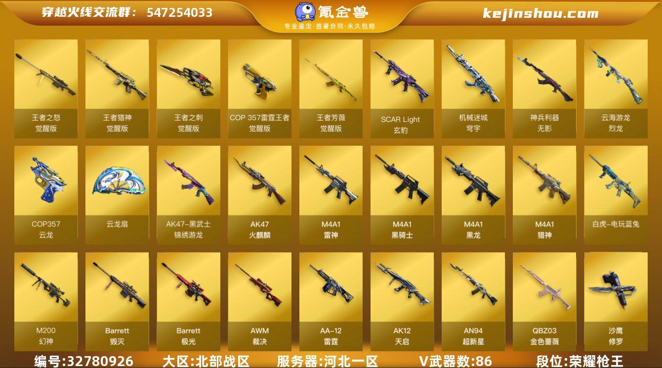 河北一区-94V-5王者武器数-0炫金武器数 【热门武器】:QBZ03-金色蔷薇,M14EBR-玄武,M200-幻神,白虎-电玩蓝兔,炼狱-迷你小钢,M4A1-黑骑士,沙鹰-修罗*5,炽芒蝶刃 【音效卡】:天神-动感闪耀 音效卡,烈火-动感闪耀 音效卡,屠龙-云海游龙音效卡,AN94-超新星-热带奇洋音效卡,AK47-火麒麟音效卡,M4A1-雷神音效卡,M4A1-黑骑士音效卡,Barrett-毁灭音效卡,70KG语音包 【皮肤】:幻神-纸灯龙皮肤,幻神-电流骇客 皮肤,QBZ03-巅峰荣耀皮肤,雷神-荣耀之魄,雷神-星空,雷神-宠儿-2019MVP,火麒麟-轻羽皮肤,火麒麟-白虎,火麒麟-心动糖果,毁灭耀金皮肤,毁灭-风暴,黑骑士-战神马超,黑骑士-破界 皮肤,黑武士-典韦皮肤,战神-粉色甜心皮肤*2,AK47-B-常胜将军-曹操,AK47-B-常胜将军-刘备*2,AK47-B-常胜将军-孙权,极光-高能霹雳 皮肤,屠龙-荣耀之锋,屠龙-春桃 皮肤,屠龙-破浪逐光 皮肤,龙啸-冠军之啸,擎天-冠军之击 【角色】:关小雨,兰-巾帼英雄,星际战将,雨墨,机械姬,战地猎狐,王者潘多拉,蛇隐宗,奇洋探员,乔伊教练,修道士,云海玲珑,暗夜-X,暗夜审判,初恋灵狐,风暴女,嘉年华灵狐,娟娟,龙儿,麻雀,萌儿,女战神,潘多拉-X,潘多拉-甜心教官...