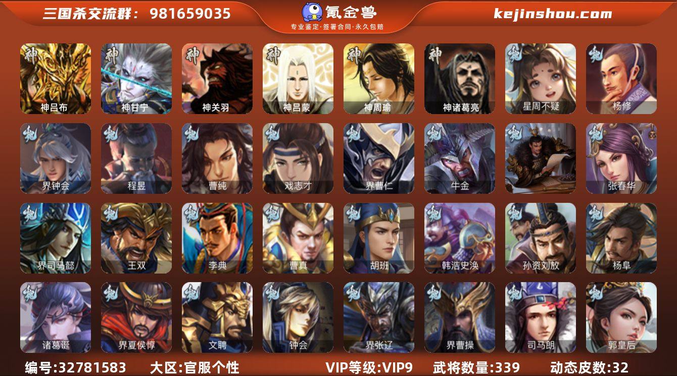 【14789844】官阶:大将军;VIP等级:VIP9;史诗武将数量:31;动态皮肤数量:32;武将总数:339;史诗宝珠数量:0;将魂数量:10037;神将:3;魏国史诗武将:19;蜀国史诗武将:7;吴国史诗武将:4;群史诗武将:12