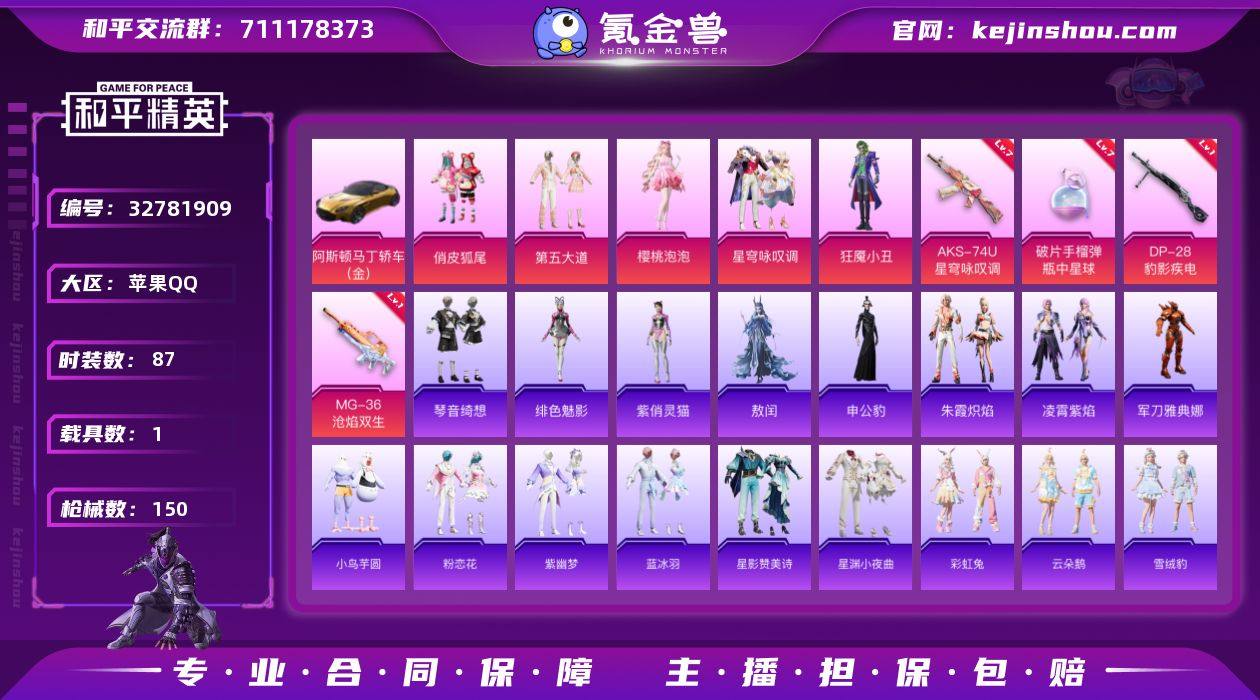 【特价出售/店主推荐】苹果 手Q-5粉装-4特效枪-1载具-1粉色飞行器-43786热力值-1王牌印记-87套装-150枪皮【热门品类】:角色-军刀雅典娜【粉色套装】:粉装-俏皮狐尾,粉装-第五大道,角色-樱桃泡泡,粉装-星穹咏叹调,角色-狂魇小丑【粉色枪皮等级】:AKS-74U-星穹咏叹调(七级),DP-28-豹影疾电(一级),MG-36-沧焰双生(一级),破片手榴弹-瓶中星球(七级)【粉色载具】:阿斯顿马丁DBS(金)【粉色枪皮】:AKS-74U-星穹咏叹调,DP-28-豹影疾电,MG-36-沧焰双生,破片手榴弹-瓶中星球【粉色飞行器】:炫彩糖果飞行器