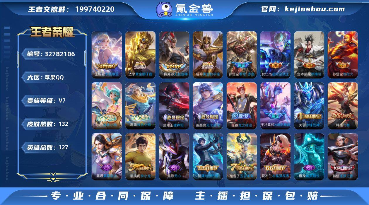 实名: 可修改 性别: 男号 贵族等级: V7 英雄数: 127 皮肤数: 132 传说皮: 黄金狮子座,黄金射手座,久胜战神,地狱火,零号·赤焰,超时空战士-狄仁杰,惊梅引,长夜焕生 限定皮: 冰锋战神,李小龙,梁祝,飞衡,乒乒小将,冰霜恋舞曲,逐梦之影,五谷丰年 亮点: 【优质装备】:黄金狮子座,黄金射手座,久胜战神,地狱火,零号·赤焰,超时空战士-狄仁杰,惊梅引