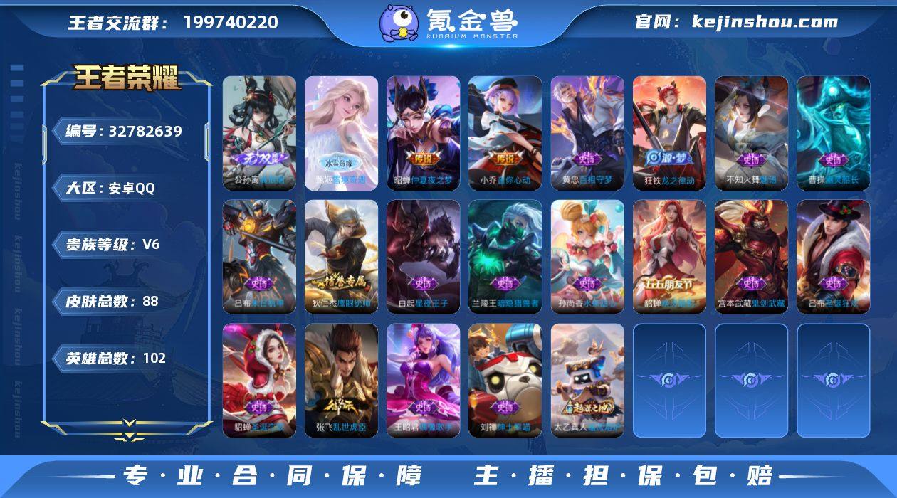 贵族6/皮肤88/传说5/史诗24/英雄102/孙权全皮/敖隐全皮/甄姬-雪境奇遇/公孙离-离恨烟/伽罗沧流箭/貂蝉神骥聚万邦/后羿神树通天/桑启-鸣野蒿/小乔-音你心动/貂蝉-仲夏夜之梦/姜子牙-天穹之誓/狄仁杰-阴阳师/赵云-皇家上将/狄仁杰-魔术师/项羽-海滩派对/太乙真人-谧流熔炉/钟馗虚灵犬护/甄姬逆浪荇歌/亚瑟荣光之誓/周瑜线条小狗/小乔线条小狗/太乙真人瓦猫非猫/少司缘巫礼祀神/西施织梦人/百相守梦-黄忠/龙之律动/貂蝉-唤灵魅影/西施-诗语江南/不知火舞-魅语/狄仁杰-鹰眼统帅/白起-星夜王子/兰陵王-暗隐猎兽者/张飞-乱世虎臣/吕布-末日机甲/曹操-幽灵船长/刘禅-绅士熊喵/吕布-圣诞狂欢/孙尚香-水果甜心/宫本武藏-鬼剑武藏/王昭君-偶像歌手/甄姬-冰雪圆舞曲/貂蝉-圣诞恋歌/影百相守梦/桑启线条小狗/虞姬溯影追猎/曹操逐霄之志/艾琳鹤鸣心笺/孙权径山谋武/哪吒罗小黑战记/鬼谷子克喵/莱西奥踏浪烽翎/云中君云械蓝图/白起死霸装/张良灵野札记/戈娅-玫蓝誓约/姜子牙-星梦巡礼/西施-雪境奇遇/兰陵王-幻夜行动/姬小满-零食大作战/刘禅-唤灵魔甲/鲁班大师-乓乓大师/大乔-守护之力/王昭君-幻想奇妙夜/钟无艳-海滩丽影/关羽-龙腾万里/甄姬-花好人间/张飞-五福同心/花木兰-兔女郎/达摩-拳...