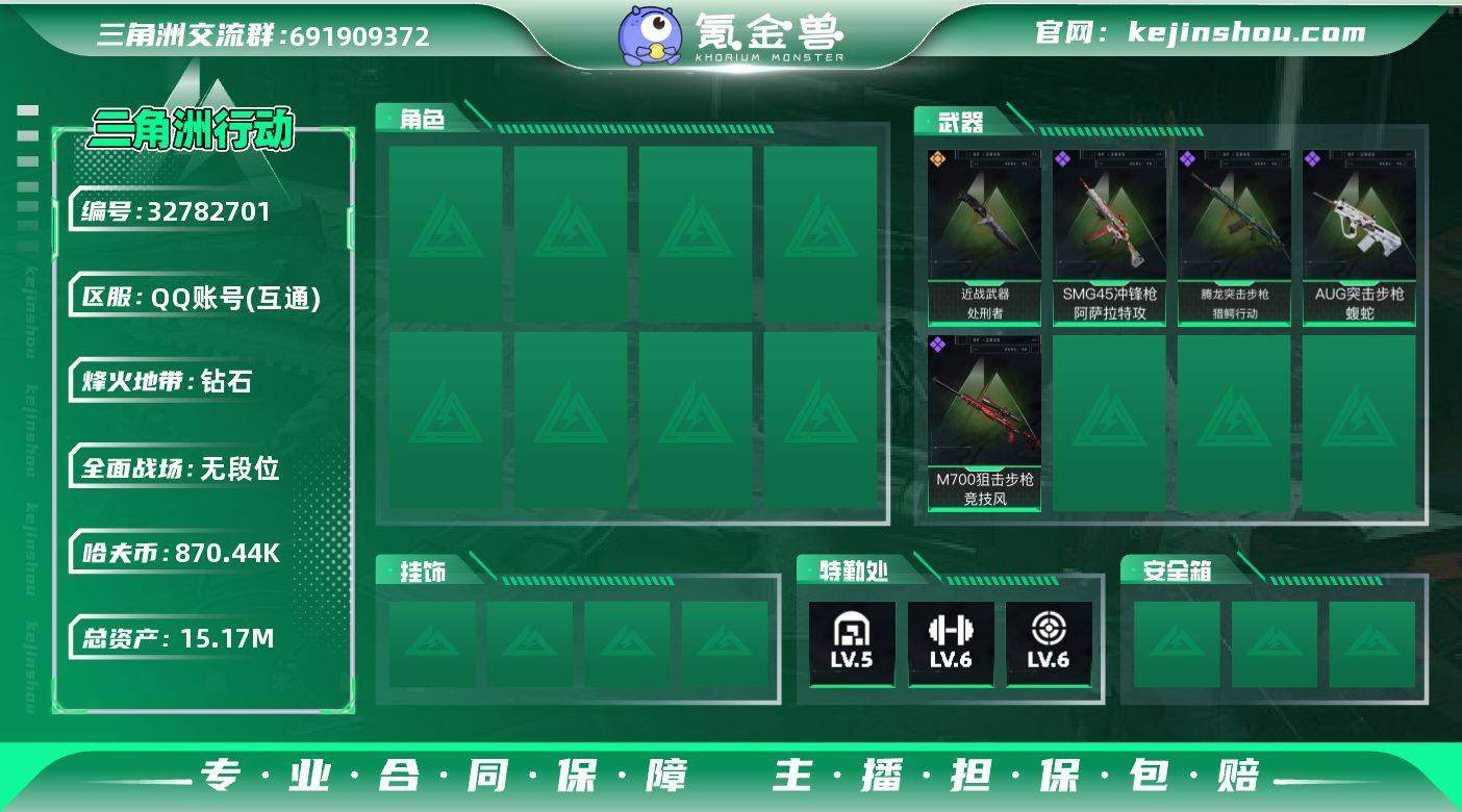 SJ363【总资产15M,哈夫币870K,行动等级:60,近战数量:1,枪皮:77】 【近战武器】 近战-黑鹰 【枪皮】 AUG突击步枪-蝮蛇 腾龙突击步枪-猎鳄行动 QBZ95-1突击步枪-海浪 K416突击步枪-几何迷彩 K416突击步枪-高雅黑 SG552突击步枪-浅蓝涂装 AKM突击步枪-肃杀 SG552突击步枪-海浪 G3战斗步枪-高雅黑 腾龙突击步枪-三角洲力量 SCAR-H战斗步枪-荣耀列队 SV-98狙击步枪-哈夫克航天 SV-98狙击步枪-红色涂装 M700狙击步枪-竞技风 勇士冲锋枪-冰天雪地 SMG-45冲锋枪-行动开启 Vector冲锋枪-几何迷彩 MP5冲锋枪-海色 MP5冲锋枪-黄蜂 SMG-45冲锋枪-幻影结构