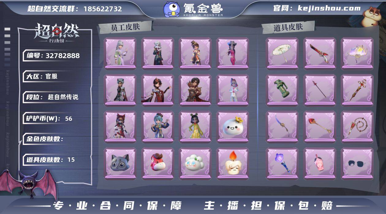 11紫 梦居8 铲铲币56261 紫皮11;道具皮15;皮肤:莉莉-莓果陷阱,零-搬开山,爱丽丝-耀眼的你,薇薇安-仙锋小姐,艾伦-黎明猎手,艾伦-绒绒对决,爱德华-梵卓之礼,阿念-迷途僵宝,逍遥-万迭云华,小黄-呱呱雨衣,阿念-庆宴绮愿;道具:急救包-末章心跳,桃木剑-小羊波德莱尔剑,折扇-赴此良宵,刺刀-紫气东来,伞-郁金春信,短管猎枪-安魂曲,黄牛能量饮料-珍珠芭乐莓莓,夜视仪-金丝眼镜,音响-鸣沙鼓,铲子-圣心之泪,急救包-蔷薇物语,长枪-罪棘,闪光弹-金戈玄铜,专业手电-星寂,长鞭-缚誓之锁;饰品:头饰-萨卡班甲鱼头套,头饰-呆滞头套,头饰-马上有钱,头饰-芝麻糊汤圆,头饰-小财神豚豚头套,头饰-饺饺者头套,头饰-煤球喵头套,头饰-火爆了头套,头饰-太空鲨头套,头饰-哈士奇头套,头饰-雪墩墩头套,头饰-面具马头套,头饰-烈焰红唇头套,头饰-鱼头怪头套,头饰-滑稽头套,头饰-烛光纪念,头饰-卑微头套,头饰-蒜了八,头饰-小羊的王子梦,头饰-惊魂南瓜头套,头饰-嘻嘻头套,头饰-樱桃奶油布丁,头饰-像素朋克墨镜,头饰-后室幸存者头套,挂饰-孤独对望,挂饰-小鲨包包,挂饰-天使消失的年代,挂饰-钗头凤,挂饰-糖果守卫,背饰-寻凉记,背饰-梵音莲华,背饰-牛啤背包,背饰-蝶恋花;动作:动作-luvaboy,动作-抖肩舞,动...
