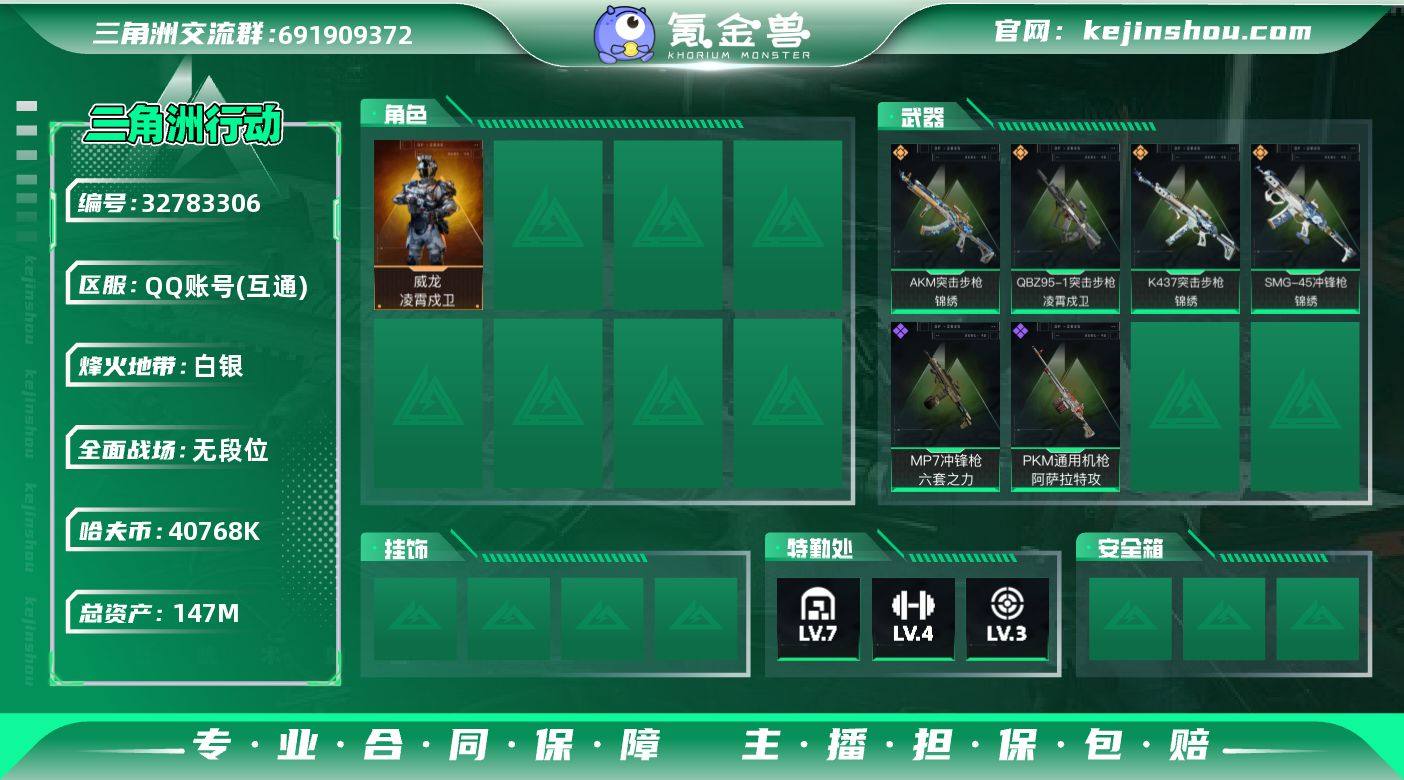 【SJZQH1433】总资产(M):147M/哈夫币(K):40768K/哈夫币(K):40768K/传说枪皮数:7/全面战场等级:1_段位:无段位/烽火地带等级:51_段位:白银/威龙-凌霄戍卫/近战-黑鹰/AKM突击步枪-锦绣/QBZ95-1突击步枪-凌霄戍卫/PTR-32突击步枪-赏金猎人/K437突击步枪-锦绣/SMG-45冲锋枪-锦绣/725双管霰弹枪-赏金猎人/.357左轮-赏金猎人/MP7冲锋枪-六套之力/PKM通用机枪-阿萨拉特攻/SCAR-H战斗步枪-荣耀列队/Vector冲锋枪-先锋/SMG-45冲锋枪-行动开启/SKS射手步枪-弄臣/G18-星链科技/G18-哈夫克航天/M4A1突击步枪-高雅黑/QBZ95-1突击步枪-海色/腾龙突击步枪-三角洲力量/K416突击步枪-几何迷彩/M16A4突击步枪-高雅黑/SG552突击步枪-狂欢/G3战斗步枪-高雅黑/CAR-15突击步枪-狂欢/AS Val突击步枪-黑巧甜心/P90冲锋枪-黑巧甜心/UZI冲锋枪-狂欢/M1014霰弹枪-高雅黑/QJB201轻机枪-典雅/SR-25射手步枪-黄蜂/SV-98狙击步枪-红色涂装/挂饰-凌霄戍卫/挂饰-福禄/挂饰-聚宝盆/挂饰-悬赏令/挂饰-锦绣/挂饰-麻将