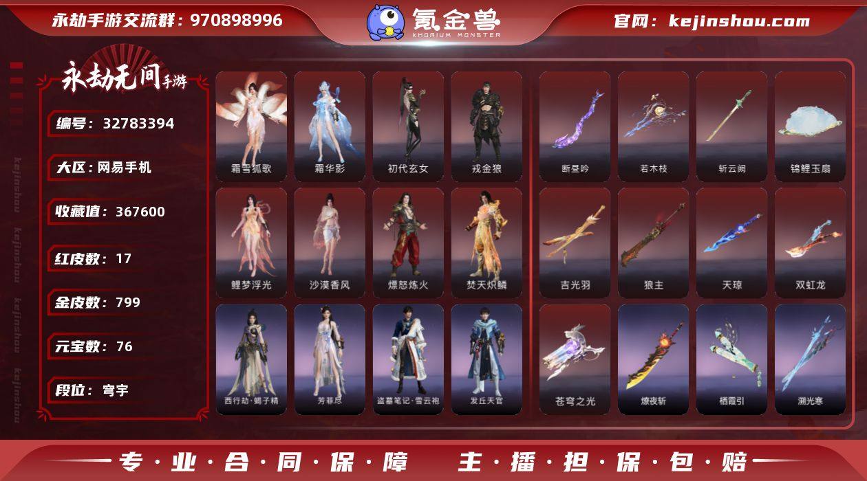 账号类型: 手机账号 网易支付状态: 未注册 换绑冷却: 有冷却 段位: 穹宇 收藏值: 367600 红皮数: 17 金皮数: 799 元宝数: 76 幻丝数: 198 角色红皮: 鲤梦浮光(胡桃),沙漠香风(迦南),初代玄女(宁红夜),熛怒炼火(季沧海),霜华影(顾清寒),戎金狼(特木尔),霜雪狐歌(玉玲珑),焚天炽鳞(季沧海) 武器红皮: 吉光羽(太刀),狼主(阔刀),天琼(匕首),锦鲤玉扇(扇子),双虹龙(双刀),苍穹之光(五眼铳),斩云阙(横刀),若木枝(双戟),断昼吟(链剑) 南宫锦金皮: 芳菲尽,西行劫·蝎子精 沈妙金皮: P5R·奥村春 NOIR,绿野守护·悠竹萌客 刘炼金皮: 虹猫蓝兔七侠传·虹猫,金财聚辉,怀金袍,泠音戏梦·霄魄 蓝梦金皮: 观山海·乘黄,虹猫蓝兔七侠传·蓝兔,太平乐 无尘金皮: 流星群侠传·骆星尘,怪诞狂想·诡趣幻袍,荡魔,P5R·雨宫莲 JOKER,朝闻道,雨弈山河 顾清寒金皮: 南山翠暖,西行劫·玉兔精,西行劫·玄霜仙兔,春日序曲·寒芷,赤丹朱湛,代号·冰凌,倒反阴阳·霜弑,云棉巧作,寒绛点梅,观山海·白泽 崔三娘金皮: 掌珠仙子,怒浪,探海裙 宁红夜金皮: 碧水青天,九阴圣女,夜华朝,红川仙子,西行劫·蜘蛛精,封神录·云霄娘娘,冥神 殷紫萍金皮: 新倩女幽魂·花间影,2674·幻械姬,智绘·萍之缘,九州遗珍·福寿仙,棠绯醉晚,桃胭花信 妖刀...