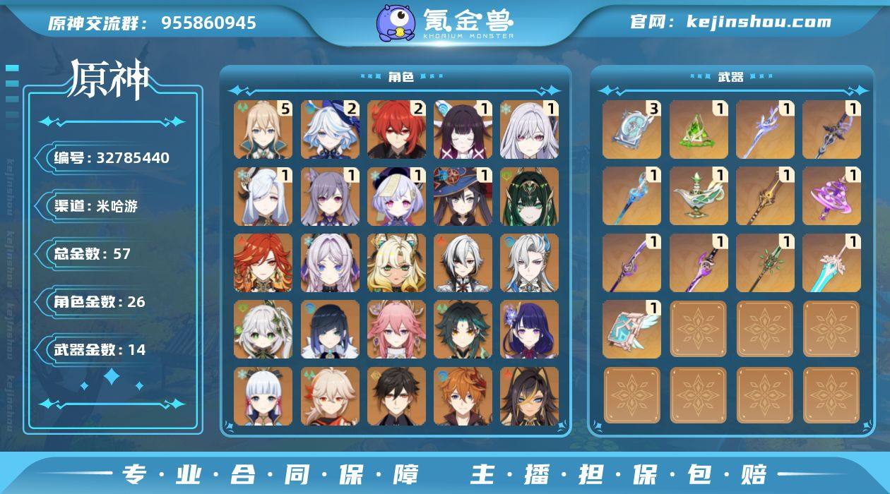 邮箱: 未绑定 总黄数: 57 冒险等级: 60 5命金色角色: 五命琴 2命金色角色: 二命迪卢克,二命芙宁娜 1命金色角色: 一命七七,一命刻晴,一命莫娜,一命申鹤,一命丝柯克,一命哥伦比娅 0命金色角色: 枫原万叶,神里绫华,达达利亚,钟离,魈,雷电将军,八重神子,夜兰,提纳里,纳西妲,迪希雅,那维莱特,阿蕾奇诺,希诺宁,玛薇卡,茜特菈莉,奈芙尔 拥有武器: 雾切之回光,四风原典,天空之卷,和璞鸢,天空之傲,薙草之稻光,神乐之真意,赤沙之杖,千夜浮梦,静水流涌之辉,赦罪,苍耀,真语秘匣 3精武器: 四风原典 1精武器: 雾切之回光,天空之卷,和璞鸢,天空之傲,薙草之稻光,神乐之真意,赤沙之杖,千夜浮梦,静水流涌之辉,赦罪,苍耀,真语秘匣