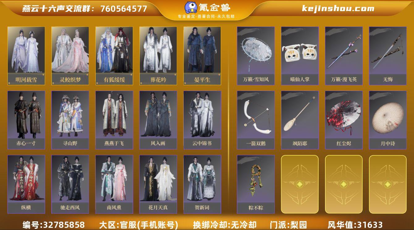 等级100,风华值31483,武林造诣3.749鹅,已用八音窍(不含染色)5。累计充值1249,清河探索6级,开封探索6级,河西探索6级,不见山探索5级,开封皇宫探索1级,套装数量22,坐骑数量5,战令等级26,宝钱23.0万,套装:葬花吟/晏平生/有狐绥绥/灵鲛织梦/蜀戏春/红尘书/清河强者/江湖客/逐红花/舞花间/遥夜行/松花玉兰/贺新词/花月天真/南风熏/驰走西风/云中锦书/纵横/风入画/燕燕于飞/明河载雪/赤心一寸;武学奇术:金穗丰穰/寒鸦渡影/雾隐关峦/红梅安岁/燃花庆夜;武学心法:明川药典100级/千香引魂蛊100级/斩雪刀法100级/十方破阵100级/易水歌六重/君臣药六重;武器外观:喵仙人掌/飒陌耶/月中诗/红尘烬/万籁·漫飞英/无悔/万籁·雪知风/粽不粽/一箭双鹅;载具:白义/盗骊/烬花舆/沙里瓦/鹕吃海塞;披挂:有狐绥绥/灵鲛织梦;发型:晏平生/葬花吟/重明/有狐绥绥/寒英/灵鲛织梦;必得绝世次数:袅袅之音131次内,袅袅之音·绑95次内;