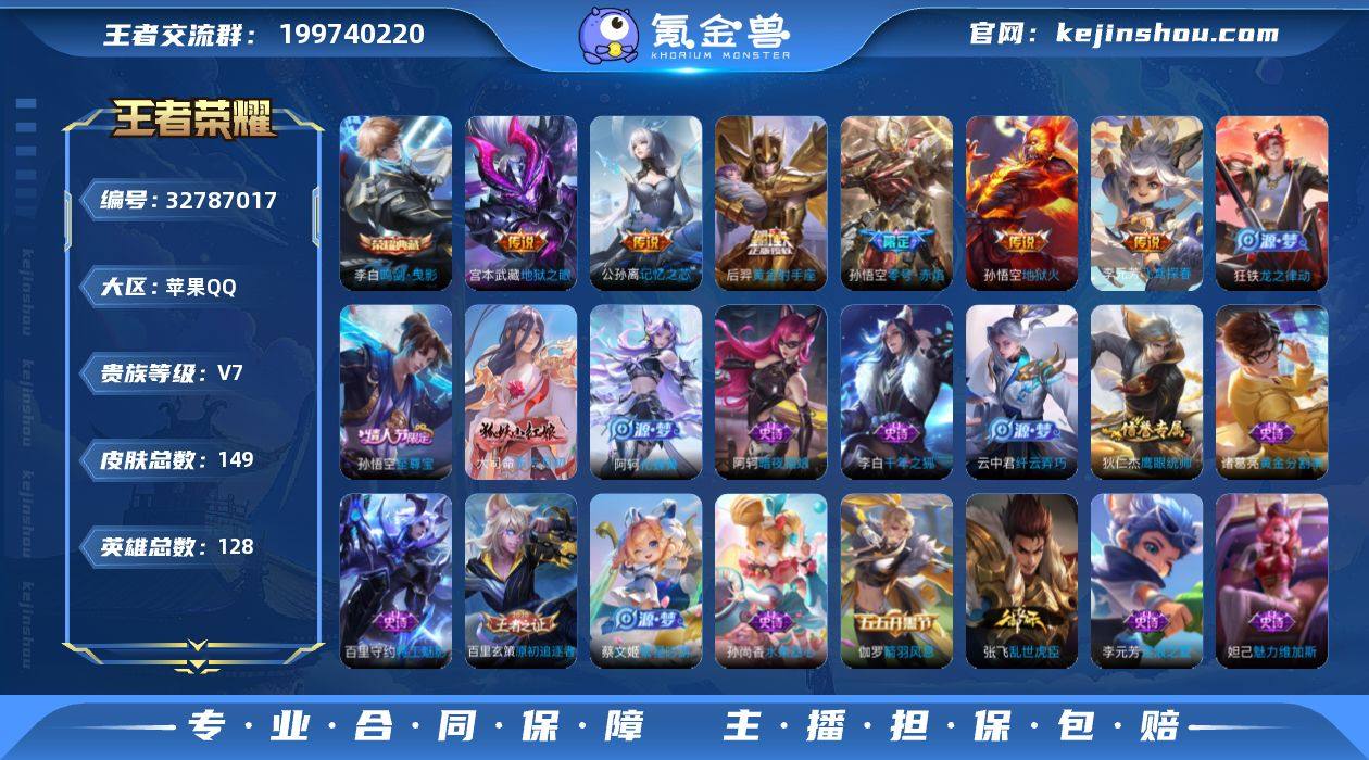 V7 1典藏 8传说 128英雄 149皮肤 可修改实名 【英雄全皮】敖隐全皮,蚩奼全皮,大禹全皮 【稀有英雄】大司命,敖隐(小龙人),夏洛特(夏师傅),金蝉(唐僧),戈娅,赵云,嬴政(始皇帝),韩信(韩跳跳),艾琳,不知火舞,娜可露露(鸟人),橘右京(橘子) 【荣耀水晶】鸣剑·曳影 【传说皮】神树通天,黄金射手座,地狱之眼,记忆之芯(机甲兔),零号·赤焰,地狱火,飞鸢探春 【珍宝阁皮】蔷薇恋人 【赛季/战令皮】朔风刀(s17),醍醐杖(s20),御銮(s16),烛龙(s10),穷奇(s12),御旌(s15),狮舞东方,赤莲之焰,天穹之誓(s36),云间偶戏,驯魔猎人,疑决卦(s19),暗影游猎(游乐娃子),原初探秘者(s21),潮玩骑士王,西部大镖客-猪八戒,万华元夜(s22),云中旅人(s29),混沌棋(s18),神迹守卫-钟馗,驱傩正仪(s24),御狮(s13) 【史诗皮】猫狗日记-大乔,暗夜猫娘,化蝶舞,线条小狗-小乔,箭羽风息,乱世虎臣,水果甜心,浮梦罗烟,紫霞仙子,巫礼祀神,线条小狗-周瑜,黄金分割率,千年之狐,龙鼓争鸣,鹰眼统帅,光弋星穹,原初追逐者,冰冠公主,纤云弄巧,逐浪之夏,东方月初,特工魅影,繁星吟游(呼啦呼啦),魅力维加斯,偶像歌手,龙之律动 【限定皮】李小龙,天狼狩猎者,梁祝,诗剑行,至尊宝 【普通皮】战争骑士,圣殿之光,逐霄之志,爱心护理,...