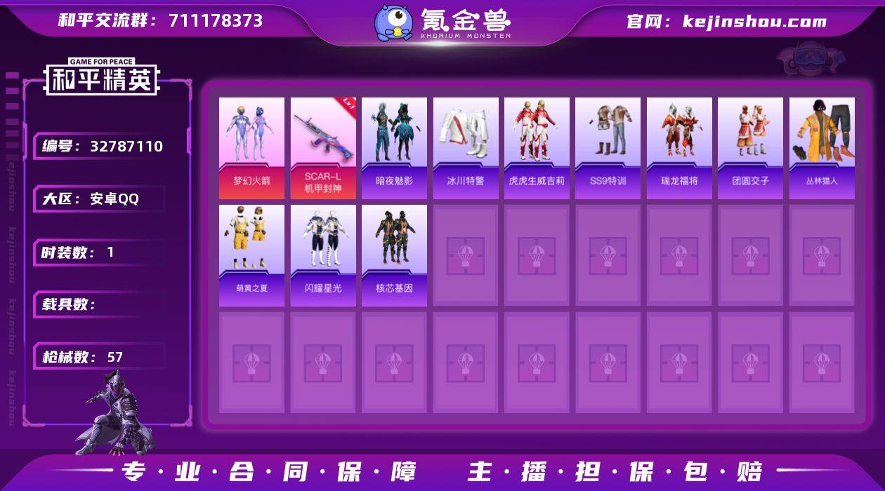M1047273有二次【梦幻火箭1粉装-1特效枪-】 安卓手Q-1粉装-1特效枪-35套装-57枪皮-0王牌印记-英勇黄金Ⅳ-16819热力值【1粉装】梦幻火箭【1特效枪】SCAR-L-机甲封神[4级]【1稀有】M762-奇异狩猎者【1飞行器】红色滑翔尾迹【1头盔】梦幻火箭头盔【2背包】雪国精灵背包,梦幻火箭背包【89其它衣服和枪皮】黑色伏地魔,丛林猎人,圣诞大吉,萌黄之夏,长空猛禽,牛气冲天,吉莉礼服,SS17特训,SS19特训,核芯基因,萌趣颜团子,传奇侦探,SS13特训,牛气满满,闪耀星光,怒火燎原,骑行爱好者,SS9特训,战地菁英,SS12特训,冰川特警,凛冬战士,飞行日记,SS14特训,团圆交子,魅力单车,虎虎生威吉莉,冷焰舞者,福星高照,蓝色守护者,SS15特训,暗夜魅影,瑞龙福将,绮丽涂鸦,撬棍-传奇侦探,AKM-夜灯,UMP45-夜灯,Kar98K-梦幻火箭,Mini14-梦幻火箭,SCAR-L-红色方程式,Win94-瑞龙福将,S12K-破晓战魂,AUG-耀粉歌者,平底锅-冰封烈焰,平底锅-黑色刀锋,M416-红色方程式,UZI-红色方程式,平底锅-瑞龙福将,UZI-古堡领主,Mini14-耀粉歌者,VSS-华贵君王,M416-夜灯,平底锅-飞行日记,Kar98K-红色方程式,AKM-生命誓言,Vector-彩虹符号,MG3-瑞龙福将,S12K-瑞龙福将,Kar98K-彩虹符号,GROZA-黑色刀锋,AKM-虎虎生威,QBZ-彩虹符号,U...