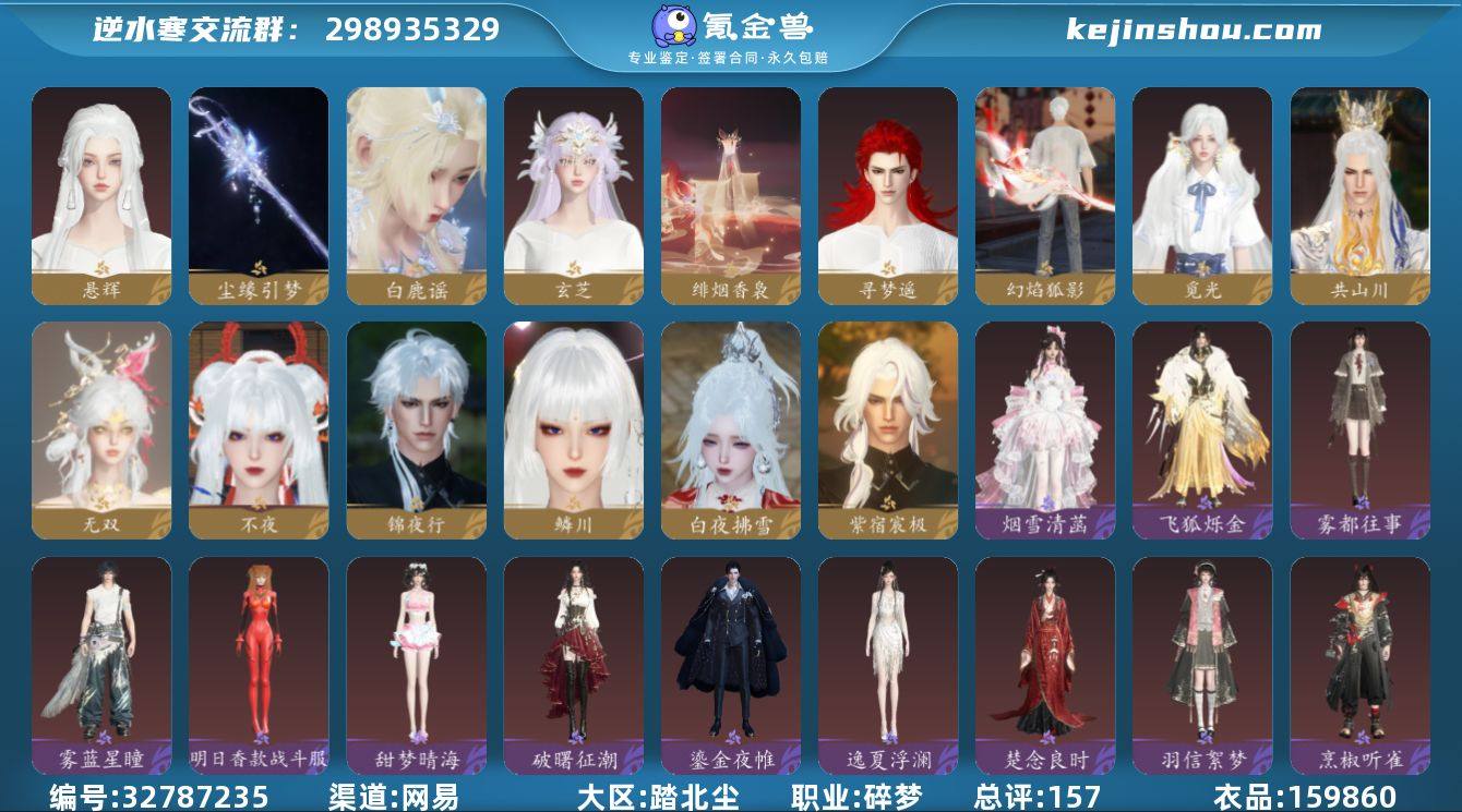 -区服:瑶光听雪 -职业:碎梦(热门输出外加三张转职卷) - 总评:1575547,副本进攻35.4万+ - 馆藏5级,衣品79330,多页满衣柜 - 限定时装/联动/多白发/高品质武器外观 - 上手即玩,无短板,安全换绑(未绑定手机号) - 急出 1600不刀,走平台包赔,非诚勿扰 -背包内有情人节时装一套,两套288自选,两张月卡,一个柳沧海白发