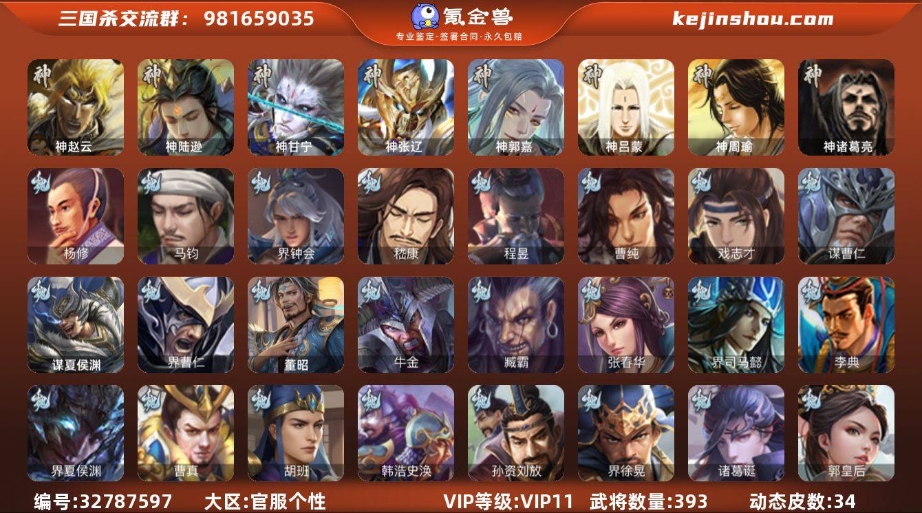 官阶:大将军;VIP等级:VIP11;史诗武将数量:44;动态皮肤数量:34;武将总数:393;史诗宝珠数量:0;将魂数量:5842;神将:6;魏国史诗武将:24;蜀国史诗武将:7;吴国史诗武将:7;群史诗武将:17