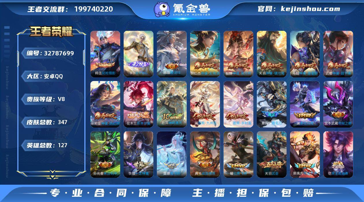 0B8GTD不可二次V8"""346皮肤无双1水晶1传说36优质限定28 钱包无法注销、信用分正常、无设备脸 水晶皮肤:弑枪猎影, 无双皮肤:碎月剑心, 新传说限定:神骥·镇沧海,异界灵契-花木兰,神骥·逐星野,神骥·越千峰,神骥·聚万邦,神骥·赴朔漠,神骥·鸣幻洲, 传说限定:夏侯惇霜北刀,武圣,愿照·九州拓,画中仙,愿照·岁时盈,神树通天,启明星使, 传说皮肤:一念神魔,典韦战鼓燎原,霜月吟,铠冥王哈迪斯,祥瑞亨通,澜逐花归海,幻光神枪,末日机甲-孙尚香,云霓雀翎,冠军飞将,胖达荣荣,淬星耀世,地狱之眼,惊梅引,地狱火,绛天战甲,云鹰飞将,音你心动-周瑜,仲夏夜之梦,猫影幻舞,久胜战神,鸣野蒿, 新史诗限定:罗小黑战记-百里玄策,万灵启世,织梦人,涂山容容,百晓客, 史诗限定:决胜骁骑,瑞麟志,岱宗,谪仙醉月,孙行者,器灵·浮梦炉,雪夜绮愿(周瑜),辉光之辰,逐梦之影, 新史诗皮肤:战舞者,灵蛊蚀心,上官婉儿群星魔术团,星界特工,石田雨龙,百相守梦-黄忠, 优质史诗皮肤:天秀·启明,雪上飞焰,永昼,晚萤,修罗,千筹问战,魅语,诗语江南,时之恋人-孙尚香,怒海争锋,白蛇, 周年皮肤:李小龙,江河有灵,梁祝,鹤鸣心笺,神树通天,高山流水,五谷丰年, 珍宝阁:优雅恋人,万物之道,蔷薇恋人,锁墨魂, 史诗...