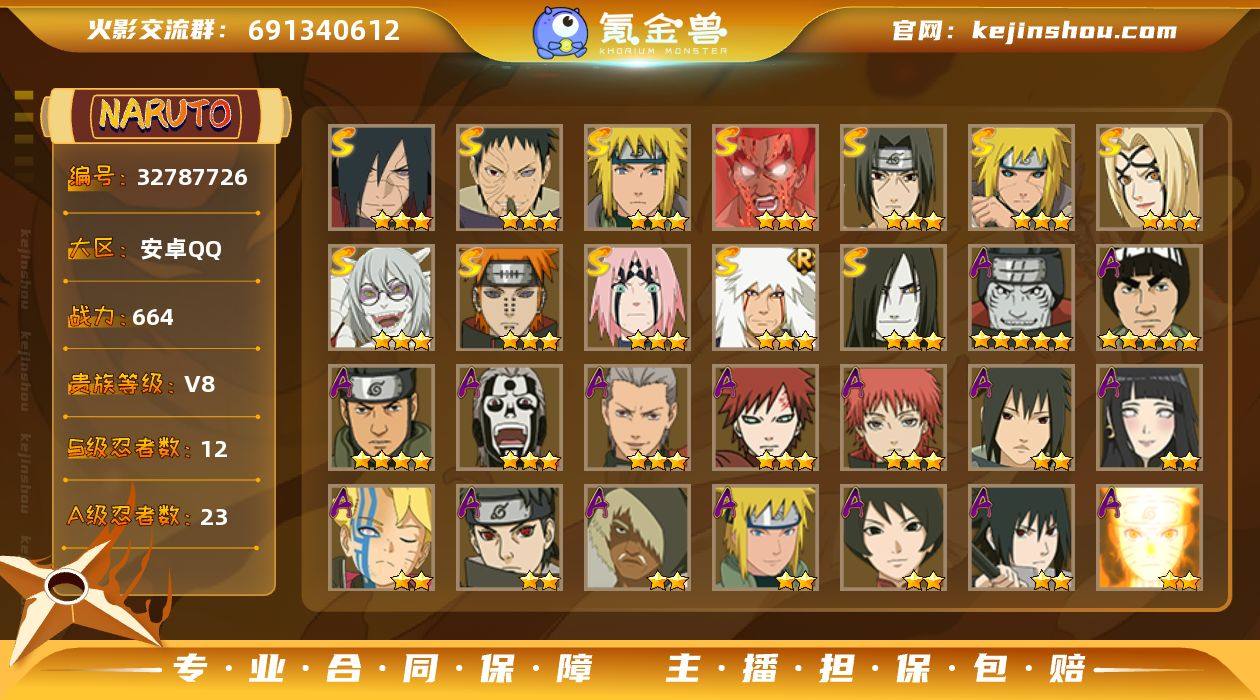 【2464】(可免费转苹果)V8,战力664W,12S级忍者数-23A级忍者数。纲手98片,最终章舍人50片,博人传桃式55片,ME1677 【S级忍者】:波风水门「秽土转生」(3星),宇智波斑「秽土转生·解」(3星),春野樱「忍界大战」(3星),宇智波带土「忍界大战」(3星),宇智波鼬「须佐能乎」(3星),自来也「舞之豪杰」(3星),大蛇丸(3星),纲手「百豪」(3星),波风水门(3星),药师兜「仙人模式」(3星),迈特凯「死门」(3星),佩恩「天道」(3星) 【A级忍者】:波风水门「青年」(2星),达鲁伊「博人传」(2星),迪达拉(2星),飞段(3星),飞段「死司凭血」(3星),干柿鬼鲛(5星),漩涡博人「桃式显现」(2星),漩涡鸣人「九尾查克拉」(2星),迈特凯(5星),旗木卡卡西「万花筒写轮眼」(2星),我爱罗「疾风传」(3星),我爱罗「忍界大战」(2星),蝎(3星),猿飞阿斯玛(4星),宇智波止水(2星),宇智波鼬(2星),宇智波佐助「须佐能乎」(2星),药师兜「半蛇斗篷」(2星),日向雏田「最终章」(2星),黑土「博人传」(2星),秋道丁次「忍界大战」(2星),千代「近松十人卫」(2星),宇智波泉奈(2星)