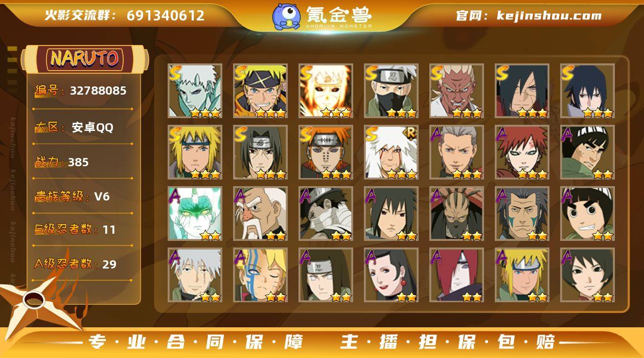 【2614】可免费转苹果 V6 385万战力 11S-29A TT1867 【S级忍者】:宇智波斑「秽土转生·解」(3星),艾「忍界大战」(3星),宇智波鼬「须佐能乎」(3星),旗木卡卡西「须佐能乎」(3星),自来也「舞之豪杰」(3星),波风水门(3星),佩恩「天道」(3星),宇智波佐助「永恒万花筒」(3星),波风水门「九喇嘛连结」(3星),漩涡鸣人·宇智波佐助(3星),宇智波带土「十尾人柱力」(3星) 【A级忍者】:长门「青年」(2星),波风水门「青年」(2星),迪达拉(2星),飞段(3星),飞段「死司凭血」(2星),干柿鬼鲛(2星),漩涡博人「桃式显现」(2星),迈特凯(2星),旗木卡卡西「忍界大战」(2星),旗木卡卡西「幻之真容」(2星),桃地再不斩「秽土转生」(2星),我爱罗「疾风传」(3星),蝎(2星),蝎「绯流琥」(2星),猿飞阿斯玛(2星),宇智波鼬(2星),宇智波佐助「须佐能乎」(2星),日向宁次「忍界大战」(2星),卑留呼「火之意志继承者」(2星),李洛克「忍界大战」(2星),黑土「博人传」(2星),秋道丁次「忍界大战」(2星),千代「近松十人卫」(2星),不缘(2星),宇智波泉奈(2星),不动(2星),大野木「侠隐江湖」(2星),巳月「仙人模式」(2星),迈特凯「青春爆炸」(2星)