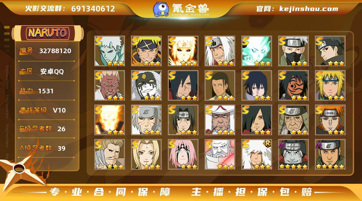 【2575】可免费转苹果 V10 1531万战力 26S-39A 组织3 有熊猫 金币1.65万 大蛇丸66片 自来也62片 仙人自来也88片 三代目风影49片 TT1858 【S级忍者】:猿飞日斩「秽土转生」(3星),千手扉间「秽土转生」(3星),宇智波斑「秽土转生·解」(3星),春野樱「忍界大战」(3星),艾「忍界大战」(3星),宇智波鼬「须佐能乎」(3星),宇智波止水「须佐能乎」(3星),旗木卡卡西「须佐能乎」(3星),千手柱间「木叶创立」(3星),鬼灯幻月「二代目水影」(3星),自来也「舞之豪杰」(3星),自来也「传说中的三忍」(3星),纲手(3星),猿飞日斩(3星),宇智波斑(3星),波风水门(3星),神秘面具男「红夜之刃」(3星),漩涡鸣人「九喇嘛连结」(3星),佩恩「天道」(3星),宇智波佐助「永恒万花筒」(3星),大筒木金式(3星),大筒木桃式(3星),大筒木舍人「最终章」(3星),波风水门「九喇嘛连结」(3星),漩涡鸣人·宇智波佐助(3星),宇智波带土「十尾人柱力」(3星) 【A级忍者】:艾「青年」(2星),长门「青年」(2星),迪达拉(2星),奇拉比(2星),飞段(3星),飞段「死司凭血」(3星),干柿鬼鲛(5星),漩涡博人「桃式显现」(2星),机械鸣人「初始形态」(2星),迈特凯(5星),旗木卡卡西「幻之真容」(2星),旗木...
