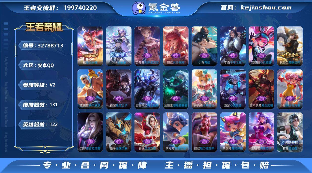 122英雄 131皮肤 可修改实名 女号 【英雄全皮】孙权全皮,蚩奼全皮,影全皮,大禹全皮 【稀有英雄】大司命,韩信(韩跳跳),夏洛特(夏师傅),艾琳,橘右京(橘子),娜可露露(鸟人),不知火舞,金蝉(唐僧),戈娅 【荣耀水晶】拾光映像(瑶典藏) 【传说皮】神树通天,音你心动-周瑜 【珍宝阁皮】万物之道 【赛季/战令皮】噬灭天穹(s37),海盐诗旅(s30),擒涛扼浪(s31),探海日志(s32),剑破天穹(s35),天穹祈灯(s34),天穹之誓(s36) 【史诗皮】蒙犽顽岩魄,化蝶舞,线条小狗-周瑜,线条小狗-小乔,万灵启世,百相守梦-黄忠,特工魅影,千年之狐,无限星赏官,青蛇,偶像歌手,猫狗日记-大乔,节奏热浪,女仆咖啡,水果甜心,星夜王子,心灵骇客,德古拉伯爵,暗隐猎兽者,鬼剑武藏,心灵战警,舞动绿茵,缤纷独角兽,乘风破浪,逐浪之夏,金属风暴,圣诞恋歌,鹰眼统帅,魅力维加斯 【限定皮】鸣野蒿 【普通皮】百相守梦-影,谧流熔炉,敬我三分,雾都夜雨,魅影绮裳,铁骨偃魂,苍林狼骑,雪境奇遇-西施,星梦巡礼,灵卦秘语,熔金海岸,春野之旅,漠中幻影,朵莉亚金色潮汐,龙舞盛年,玫蓝誓约,程咬金群星魔术团,景韶洛都,浪漫序章,虚灵犬护,荣光之誓,径山谋武,鹤鸣心笺,溯影追猎,糖果风暴,线条小狗-桑启,线条小狗-妲己,班班快跑,罗小黑战记-...
