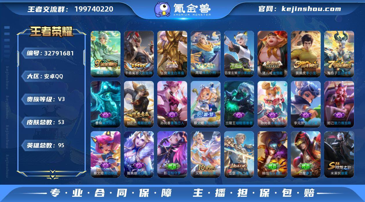 安卓Q-V3-最强王者段位-95英雄-53皮肤-3传说-14史诗 【传说皮肤】:桑启鸣野蒿,张良黄金白羊座,干将莫邪久胜战神 【限定皮肤】:狄仁杰阴阳师,孙尚香蔷薇恋人,老夫子醍醐杖,李元芳云中旅人,蔡文姬繁星吟游,鬼谷子原初探秘者,鬼谷子五谷丰年,裴擒虎李小龙,米莱狄御霄,猪八戒猪悟能,张良古海寻踪 【赛季限定】:米莱狄御霄,老夫子醍醐杖,鬼谷子原初探秘者,李元芳云中旅人,张良古海寻踪,亚瑟荣光之誓 【战令限定】:周瑜线条小狗 【史诗皮肤】:周瑜线条小狗,百里玄策罗小黑战记,鬼谷子五谷丰年,猪八戒猪悟能,裴擒虎李小龙,蔡文姬繁星吟游,狄仁杰鹰眼统帅,李元芳逐浪之夏,蔡文姬舞动绿茵,雅典娜冰冠公主,兰陵王暗隐猎兽者,曹操幽灵船长,妲己魅力维加斯,孙尚香水果甜心,孙尚香蔷薇恋人 【其他皮肤】:影百相守梦,艾琳鹤鸣心笺,亚瑟荣光之誓,廉颇功夫炙烤,朵莉亚金色潮汐,后羿完美运算,张良古海寻踪,李元芳云中旅人,刘禅唤灵魔甲,鬼谷子原初探秘者,老夫子醍醐杖,米莱狄御霄,孙尚香沉稳之力,王昭君幻想奇妙夜,钟无艳海滩丽影,狄仁杰阴阳师,后羿阿尔法小队,张飞五福同心,达摩拳王,亚瑟死亡骑士,妲己少女阿狸,安琪拉玩偶对对碰,...