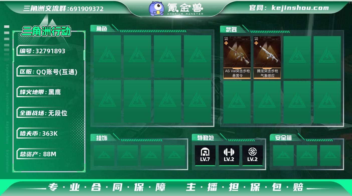 【943661】总资产:88M 1近战传说 21传说枪械 哈夫币:363.466 可二次 可修改实名 高级安全箱4.15到期 【烽火地带段位】黑鹰 【全面战场段位】无段位 【传说武器皮肤】近战武器-暗星,AS Val突击步枪-悬赏令(典藏),腾龙突击步枪-气象感应(典藏),mp7冲锋枪-电玩高手s2(典藏),SG552突击步枪-点翠,.357左轮-缄花,SR-25射手步枪-缄花,M14射手步枪-缄花,SMG-45冲锋枪-锦绣,K437突击步枪-锦绣,AKM突击步枪-锦绣,KC17突击步枪-点翠,PSG-1射手步枪-点翠,MK47突击步枪-暗星,SR-3M紧凑突击步枪-暗星,M14射手步枪-蛮荒,K416突击步枪-行动记录,腾龙突击步枪-马年祥瑞,G18-马年祥瑞,SCAR-H战斗步枪-茶蘼,PKM通用机枪-茶蘼,SR-3M紧凑突击步枪-茶蘼
