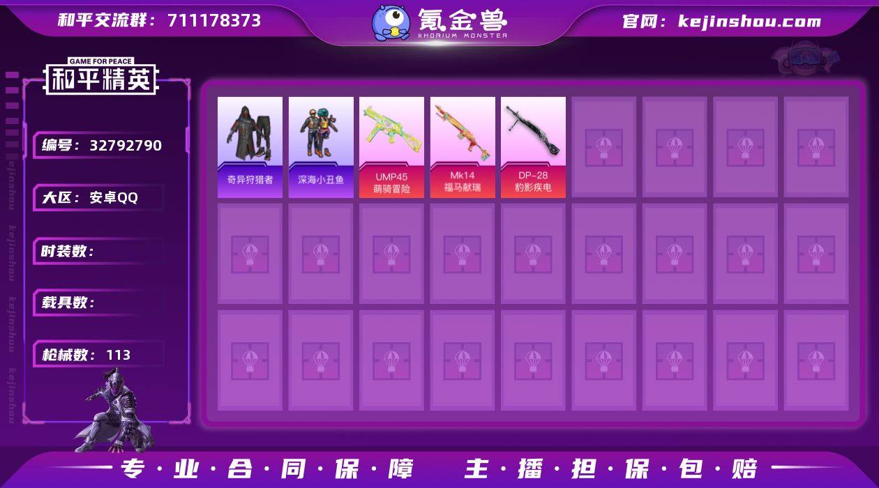 【0载具 3特效枪 0粉装 113枪皮 92套装】奇异狩猎者,深海小丑鱼,小丑鱼,NV战队服,Mk14-福马献瑞,UMP45-萌骑冒险,DP-28-豹影疾电,编号:JJXLO91
