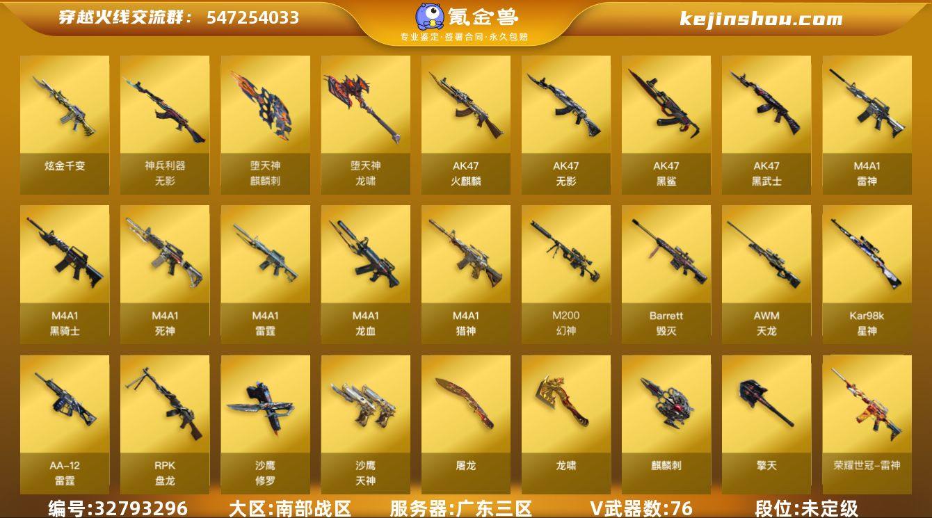 广东三区-80V-2王者武器数-3炫金武器数 【热门武器】:M200-幻神,死亡之眼,荣耀世冠-雷神,Kar98K-星神,牛牛-AK47,M4A1-黑骑士,RPK-盘龙,加特林-炼狱,雷神-小红,沙鹰-修罗*3,金刚伞 【王者炫金武器】:炫金骑士*2,炫金千变 【音效卡】:天神-动感闪耀 音效卡,女战神梧桐语音包 【皮肤】:幻神-荣耀世冠EP 皮肤,星神-璀璨皮肤,雷神-杨戬,火麒麟-雷神,火麒麟-平天大圣,火麒麟-心动糖果,M4A1-千变-孔明皮肤,黑骑士耀金皮肤,AWM-天龙-传奇白鲨,炼狱-星空,修罗-能量核心*2,屠龙-荣耀世冠AG 【角色】:炫,迷迭香,王者复仇,乔伊教练,暗夜-X,北极狐-X,初恋灵狐,芳心审判者,风暴女,嘉年华灵狐,娟娟,灵狐者-X,龙儿,麻雀,曼陀罗-X,女主播,斯沃特-X,蜀雪,兔囡囡,新娜塔莎,影武者-X 【人偶武器】:雷神-小红,巴雷特-零-水下丽影,AWM-灵狐-15周年嘉年华,M37-葵,牛牛-AK47,迷你牛魔王,迷你波特博士,夺魂,迷你牛牛,生化手雷-机甲核心,深渊终结者手雷,COP-青花瓷-斯沃特精英,迷你巨石泰坦-魔花研究所 【暴走生化】:死亡之眼,超级对讲机 【挑战大师】:冰龙粉碎者-白马银枪,激光毁灭者III,神圣爆裂者-末日III,阐释者III 【英雄级武...