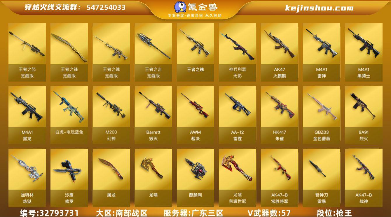 广东三区-68V-11王者武器数-0炫金武器数 【热门武器】:QBZ03-金色蔷薇,HK417-朱雀,M200-幻神,白虎-电玩蓝兔,M4A1-黑骑士,加特林-炼狱,降世魔童,沙鹰-修罗*3,荣耀世冠-龙啸,COP 357-极地霜雄 【王者炫金武器】:王者之魄 【音效卡】:M4A1-黑骑士音效卡,Barrett-毁灭音效卡 【皮肤】:幻神-周瑜皮肤,幻神-电竞之星 皮肤,QBZ03-荣耀世冠白鲨,金色蔷薇-电竞之星 皮肤,AWM-裁决-凤灵皮肤,裁决-羽掣 皮肤,雷神-暗月,雷神-荣耀之魄*5,火麒麟-华夏之心,火麒麟-平天大圣,火麒麟-心动糖果,毁灭-荣耀之怒,毁灭-星空,毁灭-CFS2020,毁灭-黑大圣皮肤,毁灭-英雄计划 皮肤,黑龙-能量核心,黑骑士耀金皮肤,无影-霓裳皮肤,战神-粉色甜心皮肤*2,战神-紫绶金章皮肤*7,战神-流金岁月皮肤*4,AK47-B-常胜将军-曹操,AK47-B-常胜将军-刘备*2,AK47-B-常胜将军-孙权,AWM-天龙-传奇白鲨*2,极光-能量核心,屠龙-春桃 皮肤*2 【角色】:王者-瞳-闭月羞花,王者-葵-貂蝉,乔伊教练,修道士,云海玲珑,幻面灵狐,暗夜-X,初恋灵狐,芳心审判者,风暴女,虎妞,嘉年华灵狐,兰-新年限定,零-水下丽影,灵狐-花神,灵狐者-X,灵狐者-黄金海岸,灵狐者-七夕宝贝,龙儿,龙...