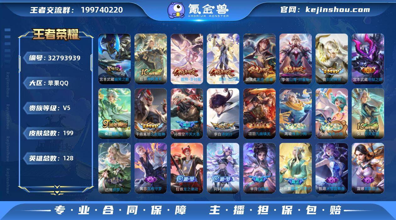 贵族5/皮肤199/传说13/史诗56/英雄128/孙权全皮/敖隐全皮/影全皮/幽冥之眼/云缨神骥越千峰/关羽神骥镇沧海/神树通天/愿照·山河定/愿照·岁时盈/鸣野蒿/齐天大圣/山海·炽霜斩/诗剑行/寅虎·赤拳/炽阳神光/久胜战神/地狱之眼/蒙犽顽岩魄/天穹之誓(s36)/破阵·退雄兵/阴阳师/寅虎·御盾/皇家上将/优雅恋人/蔷薇恋人/白晶晶/无心/海滩派对/云中旅人(s29)/五谷丰年/顽趣-梦奇/擒涛扼浪(s31)/纤云弄巧/梁祝/暖冬·兔眠/探海日志(s32)/海盐诗旅(s30)/星界游侠/江河有灵/古海寻踪(s33)/百解令(蒙犽)/鬼谷子天穹祈灯(S34)/龙武盛年/剑破天穹(s35)/程咬金群星魔术团/熔金海岸/噬灭天穹(s37)/谧流熔炉/虚灵犬护/逆浪荇歌/荣光之誓/九幽镇关/线条小狗-周瑜/线条小狗-小乔/太乙真人瓦猫非猫/万灵启世/织梦人/百相守梦-黄忠/龙之律动/化蝶舞/器灵·浮梦炉/电玩·爆裂旋风/暗渊魔法/鹰眼统帅/猫狗日记-孙策/节奏热浪/星夜王子/功夫厨神/逐浪之夏/舞动绿茵/冰冠公主/心灵战警/暗隐猎兽者/缤纷独角兽/乘风破浪/德古拉伯爵/水晶猎龙者/乱世虎臣/末日机甲-吕布/千年之狐/幽灵船长/绅士熊喵/圣诞狂欢/金属风暴/女仆咖啡/魅力维加斯/摇滚巨星/水果甜心/鬼剑武藏/地狱岩魂/偶像歌手/冰雪圆舞曲/未来纪元-赵...