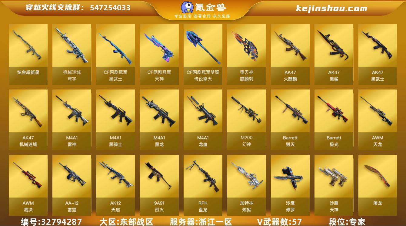 浙江一区-58V-0王者武器数-1炫金武器数 【热门武器】:M200-幻神,死亡之眼,QBZ03-街机,M4A1-黑骑士,RPK-盘龙*2,加特林-炼狱,沙鹰-修罗*6 【王者炫金武器】:炫金超新星 【音效卡】:AK47-火麒麟音效卡,M4A1-雷神音效卡,M4A1-黑骑士音效卡,Barrett-毁灭音效卡 【皮肤】:雷神-能量核心,雷神-荣耀之魄,雷神-虎将,雷神-冠军之魄,毁灭-星空,毁灭-AG-CFPLS15冠军,黑龙-能量核心*2,黑龙-暗月,黑骑士耀金皮肤,无影-霓裳皮肤,AK47-黑武士-361,战神-粉色甜心皮肤,战神-紫绶金章皮肤,战神-流金岁月皮肤,天龙-秘银,AWM-天龙-传奇70KG,AWM-天龙-传奇白鲨,极光-能量核心*2,修罗-能量核心*2,修罗-星空 【角色】:迷迭香,空,电竞少女,飞虎队-X,风暴女,零-水下丽影,灵狐者-黄金海岸,龙儿,曼陀罗-X,潘多拉-X,潜龙队-X,兔囡囡,新娜塔莎,影武者-X 【人偶武器】:迷你深渊冰龙*2,迷你牛魔王,迷你波特博士*3,夺魂*2,迷你火种,迷你生化手雷,深渊终结者手雷*3,闪光弹-小乔 【暴走生化】:死亡之眼 【挑战大师】:AK47-冰龙粉碎者,冰龙粉碎者-白马银枪,激光毁灭者III-白马银枪,激光毁灭者III,机甲撕裂者III,神圣爆裂者-末日III 【英雄级武器】:...
