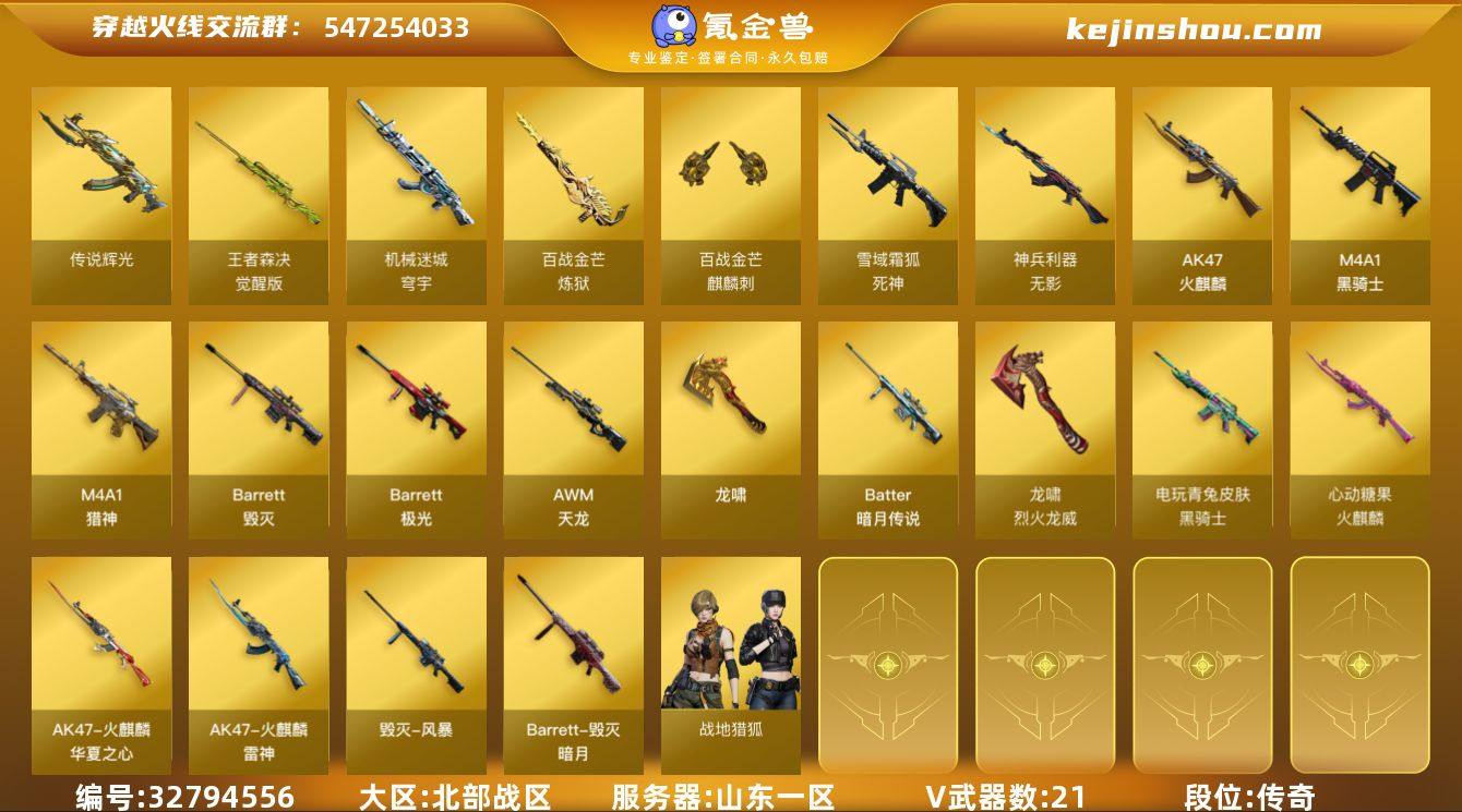 【ky6257】山东一区-23V-1王者武器数-0炫金武器数 【传说武器】:传说辉光 【热门武器】:传说辉光,QBZ03-街机,M4A1-黑骑士 【音效卡】:M4A1-黑骑士音效卡,炼狱-百战金芒-庆典舞曲音效卡,死神-雪域霜狐-怀旧音效卡,M4A1-雷神-怀旧音效卡,Barrett-毁灭-怀旧音效卡 【皮肤】:M4A1-再燃火线,火麒麟-雷神,火麒麟-华夏之心,火麒麟-心动糖果,毁灭-暗月,毁灭-风暴,黑骑士-电玩青兔皮肤,修罗-百战金芒 皮肤,轻型军用手斧-再燃火线 【角色】:战地猎狐,雪域霜狐,葵-阿尔法武装,暗夜-X,飞虎队-X,风暴女,嘉年华灵狐,兰-海滩派对,兰妹妹,灵动武士,零-水下丽影,潘多拉-X,潘多拉-甜心教官,斯沃特-X,兔囡囡 【人偶武器】:M4A1-雷神-精英刀锋,灵狐娃娃手雷 【挑战大师】:激光毁灭者III 【英雄级武器】:AK47-火麒麟*2,M4A1-黑骑士,无影-神兵利器,死神-雪域霜狐,M4A1-猎神,机械迷城-穹宇,AWM-天龙,Barrett-毁灭,Barrett-极光,Barrett-金色蔷薇,王者森决-觉醒版,Barrett-暗月传说,炼狱-百战金芒,龙啸,麒麟刺-百战金芒,龙啸-烈火龙威,高爆手雷-幻灵,闪光弹-幻灵,M4A1-赤狱骑士,AWM-昌龙 【源级武器】:火麒麟-雷神,源·雷神,魂·雷神-诺拉,...