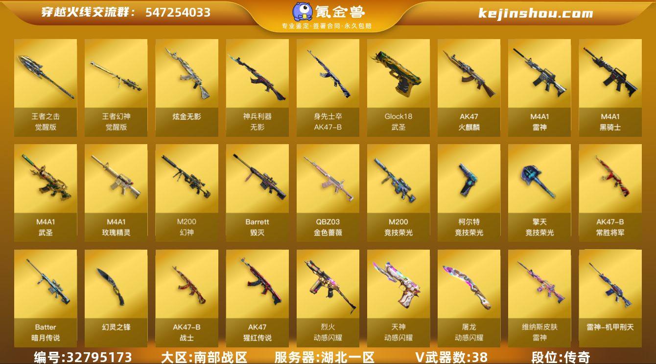 【ky6270】湖北一区-42V-3王者武器数-1炫金武器数 【热门武器】:QBZ03-金色蔷薇,M200-幻神,M200-竞技荣光,M4A1-黑骑士,USP-雷暴 【王者炫金武器】:炫金无影 【音效卡】:天神-动感闪耀 音效卡,M4A1-雷神音效卡,Barrett-毁灭音效卡 【皮肤】:烈龙-星空,雷神-暗月,雷神-虎将,雷神-机甲刑天皮肤,雷神-宇航兔皮肤,雷神-维纳斯皮肤,火麒麟-华夏之心,火麒麟-平天大圣,火麒麟-心动糖果,毁灭-星空,毁灭-黑大圣皮肤,M4A1-千变-孔明皮肤,战神-粉色甜心皮肤,战神-紫绶金章皮肤*2,战神-流金岁月皮肤*2,AK47-B-常胜将军-曹操,AK47-B-常胜将军-刘备 【角色】:电竞教官-云悠悠,王者玲珑,乔伊教练,云海玲珑,暗夜-X,初恋灵狐,风暴女*2,虎妞,嘉年华灵狐,灵狐-花神,灵狐者-七夕宝贝,麻雀,曼陀罗-X,曼陀罗-礼服,潘多拉-X,潘多拉-甜心教官,斯沃特-X,维纳斯,樱-战斗天使 【人偶武器】:AWM-灵狐-15周年嘉年华,迷你牛魔王,迷你波特博士,夺魂,迷你牛牛*2,迷你生化手雷,深渊终结者手雷*2,闪光弹-小乔,闪光弹-貂蝉,高爆手雷-大乔,迷你巨石泰坦-魔花研究所 【挑战大师】:神圣爆裂者-末日III*2 【英雄级武器】:AK47-火麒麟*2,M4A1-雷神,M4A1-黑...