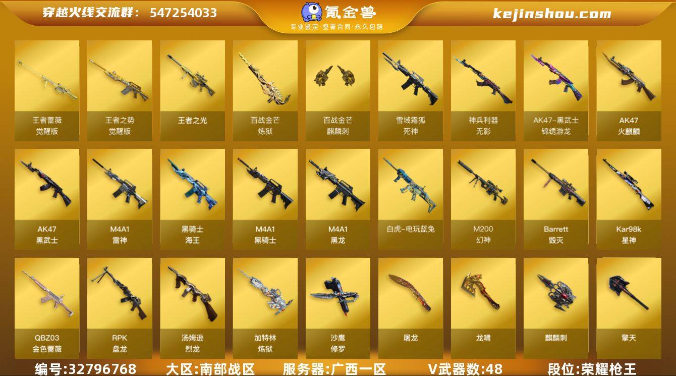广西一区-50V-3王者-0炫金 【热门武器】:QBZ03-金色蔷薇,M200-幻神,死亡之眼,白虎-电玩蓝兔,Kar98K-星神,M4A1-黑骑士*2,汤姆逊-烈龙*5,RPK-盘龙*6,加特林-炼狱,沙鹰-修罗*6 【王者炫金武器】:王者之光 【音效卡】:M4A1-黑骑士音效卡,Barrett-碧霄极光音效卡,炼狱-百战金芒-庆典舞曲音效卡,死神-雪域霜狐-怀旧音效卡,柯尔特-百战金芒-庆典舞曲音效卡,AWM-昌龙-怀旧音效卡,AK47-火麒麟-怀旧音效卡 【皮肤】:M200-幻神-黄忠皮肤,M4A1-战神赵云,M4A1-再燃火线,火麒麟-战神关羽,火麒麟-平天大圣,火麒麟-心动糖果,毁灭-战神张飞,毁灭-黑大圣皮肤,黑龙-墨子皮肤,黑骑士-冠军之势,黑骑士-战神马超,无影-能量核心,战神-粉色甜心皮肤*2,AK47-B-常胜将军-孙权,炼狱-月 皮肤,轻型军用手斧-再燃火线,擎天-秘银,麒麟刺-月皮肤 【角色】:战地猎狐,王者-葵-貂蝉,雪域霜狐,芳心审判者,飞虎队-X,嘉年华灵狐,娟娟,兰妹妹,猎狐者-追月,灵狐者-X,灵狐者-黄金海岸,麻雀,曼陀罗-X,潘多拉-甜心教官,邱刚敖,斯沃特-X,铁骑荣耀,雪莉杨-摸金校尉,夜玫瑰-幻能朋克,夜玫瑰-宠粉,樱-战斗天使,游珑儿 【人偶武器】:天龙-曼陀罗,M4A1-雷神-精英刀...