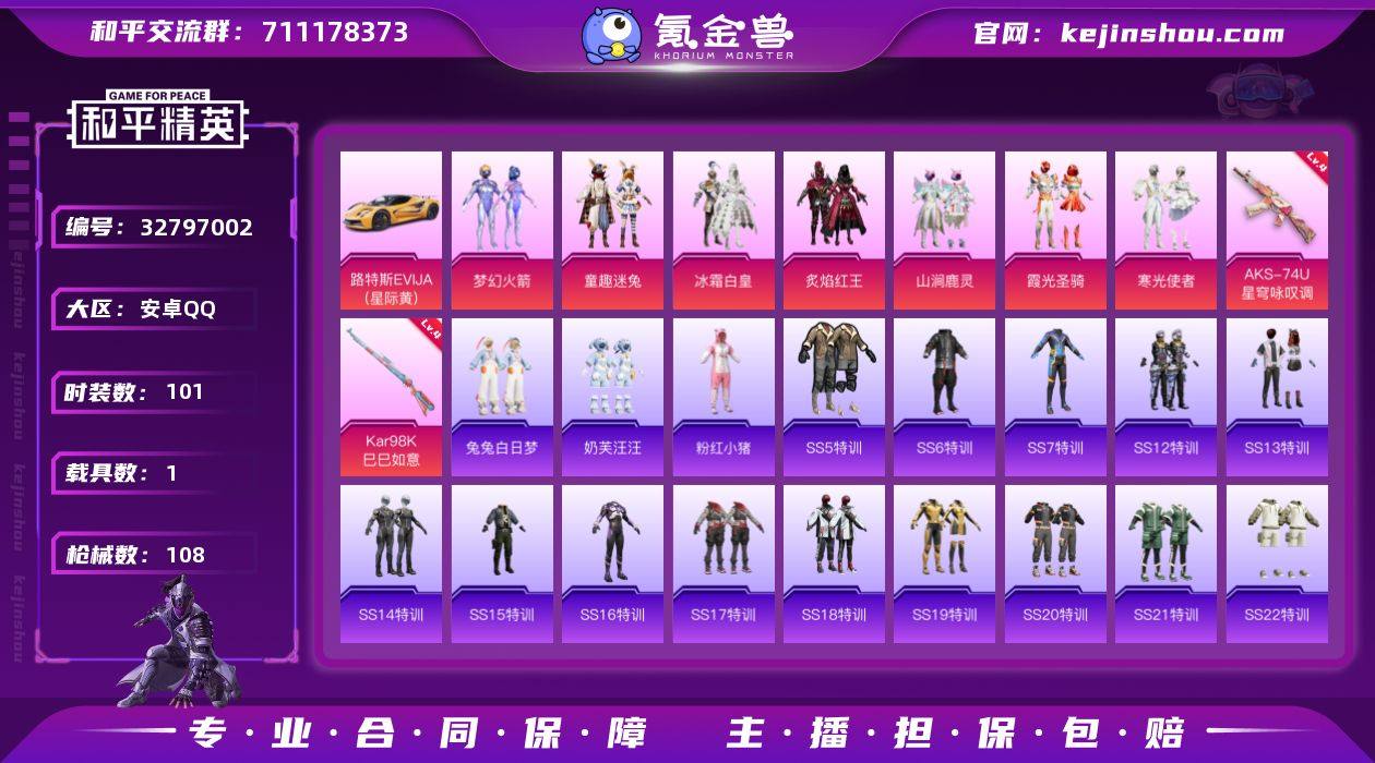 【943712】安卓【小号 粉装-梦幻火箭,AKS-74U-星穹咏叹调(四级),Kar98K-巳巳如意(四级),路特斯EVIJA(星际黄)】 手Q-7粉装-2特效枪-1载具-1粉色飞行器-38267热力值-7王牌印记-101套装-108枪皮 【热门品类】:粉装-梦幻火箭,粉装-童趣迷兔,套装-粉红小猪 【粉色套装】:粉装-梦幻火箭,粉装-冰霜白皇,粉装-童趣迷兔,粉装-炙焰红王,粉装-山涧鹿灵,粉装-霞光圣骑,粉装-寒光使者 【粉色枪皮等级】:AKS-74U-星穹咏叹调(四级),Kar98K-巳巳如意(四级) 【粉色载具】:路特斯EVIJA(星际黄) 【粉色枪皮】:AKS-74U-星穹咏叹调,Kar98K-巳巳如意 【粉色飞行器】:圣光天使飞行器 【粉色降落伞】:梦幻火箭降落伞,暗夜玫瑰降落伞,林间仙鹿降落伞,橘柚倾心降落伞,圣光天使降落伞,垂柳戏鸭降落伞,暗夜鎏金降落伞,海螺星光降落伞,炫彩糖果降落伞 【稀有套装】:套装-雪国风尚 【稀有枪皮】:AKM-夜灯,AKM-彩虹符号,AKM-筑梦精灵,AKM-虎虎生威,AKM-霓虹街区,M16A4-幻世战舞者,M16A4-甜心亚梦,M16A4-红色方程式,M16A4-魔法学院,SCAR-L-兔兔白日梦,SCAR-L-暗夜玫瑰,SCAR-L-玉兔迎春,SCAR-L-红色方程式,M416-夜灯,M416-红色方程式,M416-绯红前夜,M416-蓝...