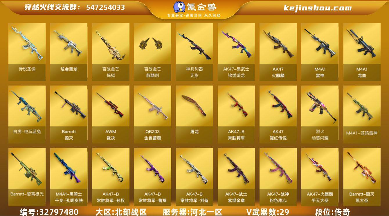 【ky5867】河北一区-36V-1王者武器数-1炫金武器数 【传说武器】:传说圣谕 【热门武器】:传说圣谕,QBZ03-金色蔷薇,死亡之眼,白虎-电玩蓝兔 【王者炫金武器】:炫金黑龙 【音效卡】:Barrett-碧霄极光音效卡,炼狱-百战金芒-庆典舞曲音效卡,柯尔特-百战金芒-庆典舞曲音效卡 【皮肤】:裁决-叶芒苍灵 皮肤,M4A1-再燃火线,雷神-神秘按键 皮肤,火麒麟-平天大圣,毁灭-暗月,毁灭-黑大圣皮肤,毁灭-英雄计划 皮肤,M4A1-千变-孔明皮肤,战神-粉色甜心皮肤,战神-紫绶金章皮肤,AK47-B-常胜将军-曹操,AK47-B-常胜将军-刘备,AK47-B-常胜将军-孙权*2,屠龙-春桃 皮肤,轻型军用手斧-再燃火线 【角色】:樱,战地猎狐,王者涂鸦,奇洋探员,乔伊教练,暗夜-X,芳心审判者,风暴女,嘉年华灵狐,娟娟,灵狐者-X,灵狐者-七夕宝贝,龙儿,麻雀,曼陀罗-礼服,潘多拉-X,潘多拉-甜心教官,青霞仙子,斯沃特-X,铁骑-乘风破浪,兔囡囡,樱-战斗天使,影武者-X 【人偶武器】:火麒麟-灵狐,M4A1-雷神-精英刀锋,AWM-灵狐-15周年嘉年华,COP-旗袍,迷你牛牛,生化手雷-机甲核心*2,深渊终结者手雷*2,迷你超能女侍 【暴走生化】:死亡之眼,超级对讲机 【挑战大师】:冰龙粉碎者-白...
