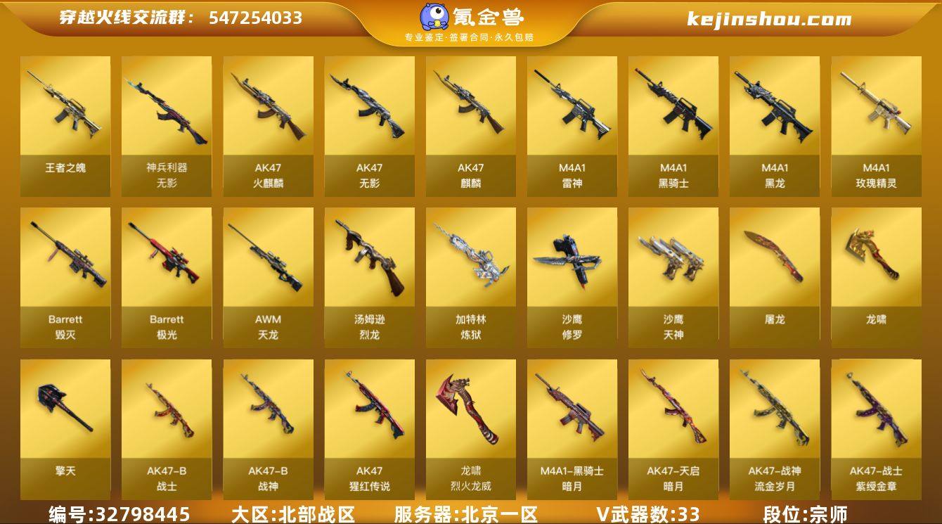 北京一区-35V-1王者武器数-0炫金武器数 【热门武器】:死亡之眼,M4A1-黑骑士,汤姆逊-烈龙*6,加特林-炼狱,斯泰尔-蝴蝶,沙鹰-修罗 【王者炫金武器】:王者之魄 【音效卡】:M4A1-黑骑士音效卡 【皮肤】:火麒麟-雷神,毁灭-英雄计划 皮肤,黑骑士-暗月,无影-能量核心,天启-暗月,战神-粉色甜心皮肤*2,战神-紫绶金章皮肤*2,战神-流金岁月皮肤*2 【角色】:灵狐者-黄金海岸,龙儿,潘多拉-X,潘多拉-甜心教官,潜龙队-X,新娜塔莎,雪莉杨-摸金校尉,影武者-X 【人偶武器】:斯泰尔-蝴蝶,迷你生化手雷,闪光弹-小乔 【暴走生化】:死亡之眼 【挑战大师】:神圣爆裂者III,阐释者III 【英雄级武器】:AK47-火麒麟,AK47-麒麟,M4A1-黑龙,M4A1-雷神,M4A1-黑骑士,AK47-无影,无影-神兵利器,M4A1-玫瑰精灵,AK-47-猩红传说*3,AK47-B-战神,AK47-B-战士,AWM-天龙,Barrett-毁灭,Barrett-极光,加特林-炼狱,汤姆逊-烈龙*6,沙鹰-修罗,沙鹰-天神*3,屠龙*2,龙啸*2,擎天,龙啸-烈火龙威,AK47-竞魂无影 【其他武器】:源·火麒麟*2,火麒麟-雷神,源-黑龙,源·雷神*3,魂·M4A1-雷神-化蛇,魂·雷神-神秘按键,魂·雷神-新春神龙,M4A1-十二生肖·龙-雷神,源·黑骑士*2,...