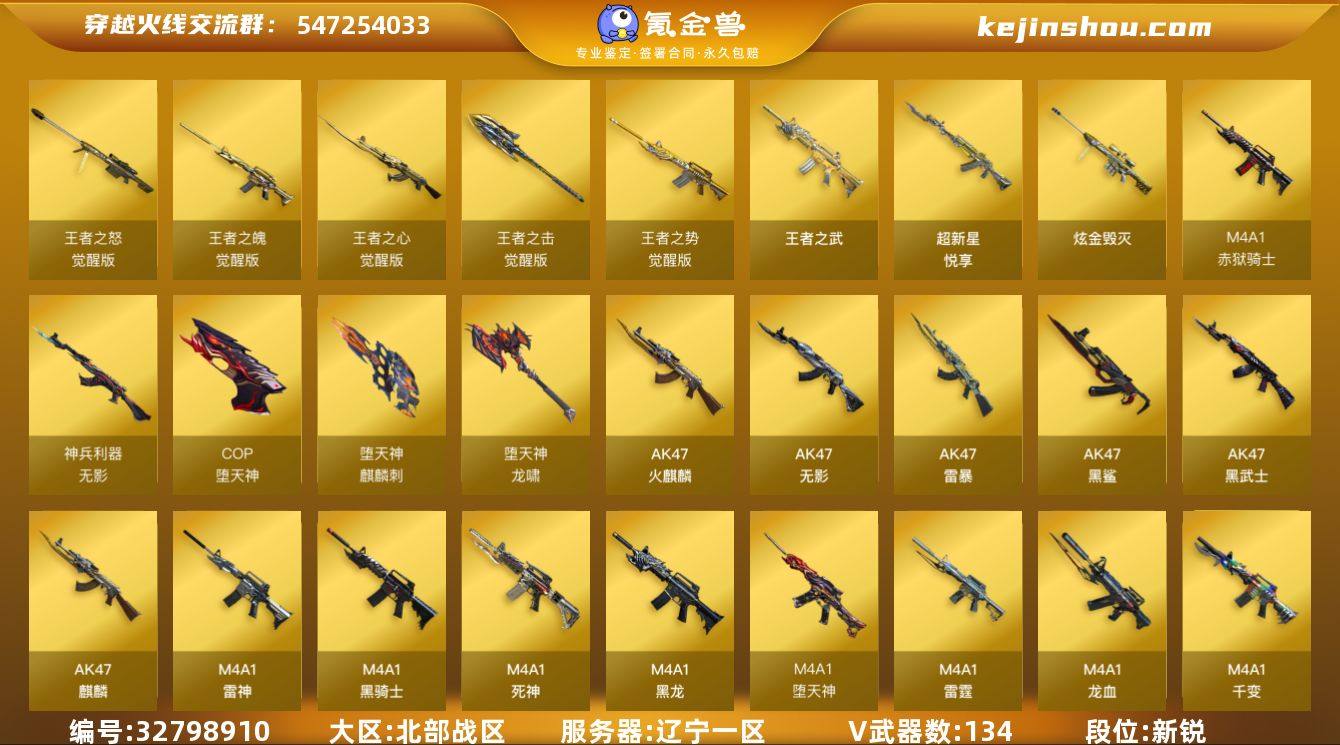 实名: 可修改 排位资格: 有 V武器: AK47-火麒麟,AK47-无影,AK47-雷暴,AK47-黑鲨,AK47-黑武士,AK47-麒麟,M4A1-雷神,M4A1-黑骑士,M4A1-死神,M4A1-黑龙,M4A1-堕天神,M4A1-雷霆,M4A1-龙血,M4A1-千变,M4A1-玫瑰精灵,Barrett-毁灭,Barrett-极光,Barrett-朱雀,AWM-天龙,AWM-裁决,M200-幻神,AA-12-雷霆,AK12-天启,HK417-朱雀,QBZ03-金色蔷薇,RPK-盘龙,汤姆逊-烈龙,加特林-炼狱,沙鹰-修罗,沙鹰-天神,屠龙,龙啸,麒麟刺,AK47-B-常胜将军,斩神刀-雷暴,AK47-B-战神,AK-47-猩红传说,龙啸-堕天神,麒麟刺-堕天神,COP-堕天神,无影-神兵利器,M4A1-赤狱骑士 王者武器: 王者之武,超新星-悦享,王者之势-觉醒版,王者之击-觉醒版,王者之心-觉醒版,王者之魄-觉醒版,王者之怒-觉醒版 炫金武器: 炫金毁灭 热门武器: COP-旗袍,巴雷特-零-水下丽影,M4A1-雷神-精英刀锋 狙击枪稀有皮肤: 毁灭耀金皮肤,天龙-能量核心,AWM-天龙-传奇白鲨,毁灭-风暴 英雄角色: 王者-零,王者-葵-貂蝉,王者玲珑-小乔,王者-瞳-闭月羞花,炫,春,樱,魅影,迷迭香,兰-海滩派对,王者春,战地猎狐 音效道具: Barrett-毁灭音效卡,M4A1-黑龙音效卡,M4A1-黑骑士音效卡 亮点: 辽宁一区-140V-8王者-2炫金【热门武器】:QBZ03-金色蔷薇,HK417-朱...