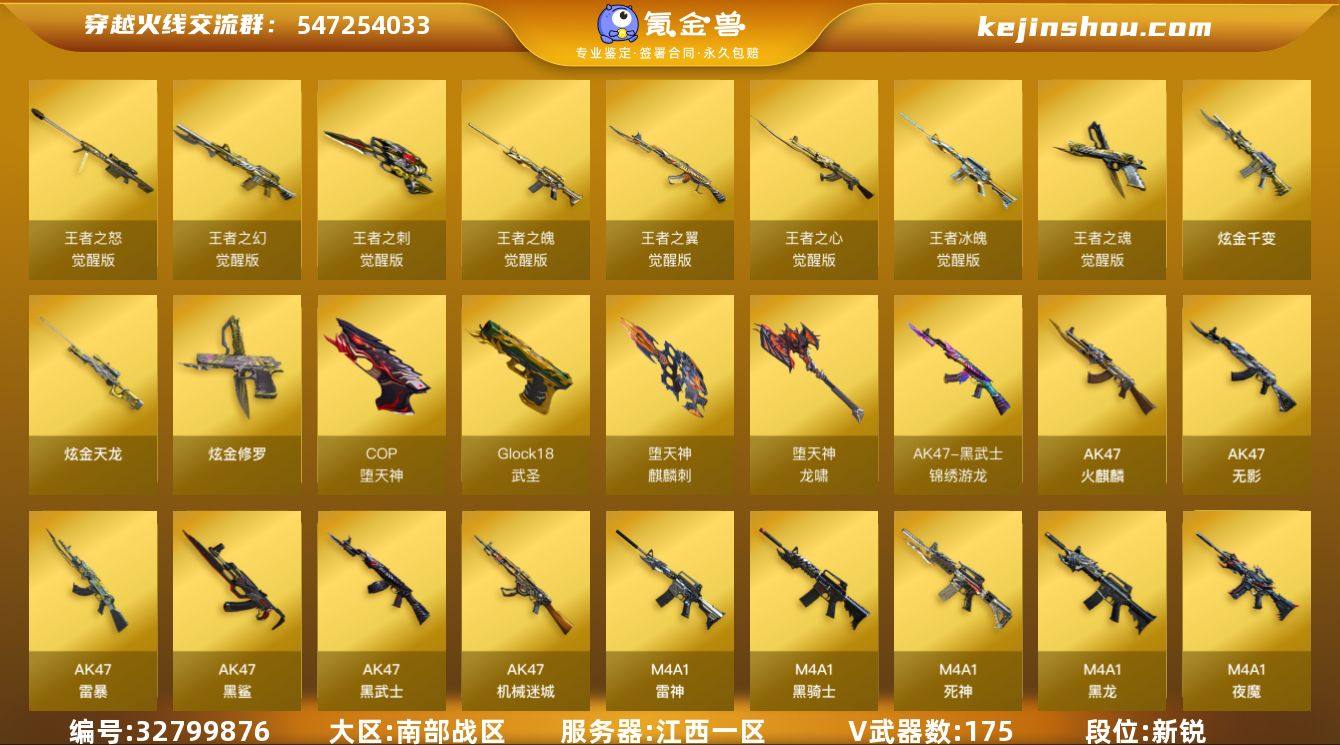 【ky5439】江西一区-189V-8王者武器数-3炫金武器数 【热门武器】:QBZ03-金色蔷薇*2,Scar Light-白虎,死亡之眼,炼狱-迷你小钢,M4A1-黑骑士,汤姆逊-烈龙*6,RPK-盘龙*6,加特林-炼狱*2,斯泰尔-蝴蝶,USP-雷暴,COP-堕天神,沙鹰-修罗*6 【王者炫金武器】:炫金千变,炫金天龙,炫金修罗 【音效卡】:Barrett-毁灭音效卡 【皮肤】:雷神-暗月,雷神-星空,火麒麟-雷神,毁灭-暗月,毁灭耀金皮肤,毁灭-魔灵皮肤,黑龙-暗月,黑骑士-暗月,无影-暗月*2,无影-能量核心,天龙-秘银,极光-能量核心,修罗-能量核心 【角色】:零,葵,魅影,炫,春,迷迭香,王者葵-惊若翩鸿,王者王力宏,堕落女神,初恋灵狐,芳心审判者,风暴女*2,嘉年华灵狐,灵狐者-黄金海岸,龙儿,铁骑荣耀,兔囡囡,樱-战斗天使,影武者-X,游珑儿 【人偶武器】:炼狱-迷你小钢,斯泰尔-蝴蝶,巴雷特-零-水下丽影,加特林-机械猎手,AWM-灵狐-15周年嘉年华,M37-葵,COP-旗袍*2,迷你生化手雷,生化手雷-机甲核心 【暴走生化】:死亡之眼 【英雄级武器】:M4A1-千变,AK47-火麒麟*2,M4A1-黑龙,M4A1-雷神*2,M4A1-黑骑士,AK47-无影,M4A1-死神,AK47-黑武士,AK12-天启*2,M4A1-武圣,AK47-机械迷...