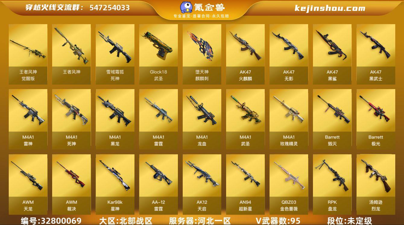河北一区-99V-3王者武器数-0炫金武器数 【热门武器】:QBZ03-金色蔷薇*2,金色蔷薇-古蛇迷踪,修罗-古蛇迷踪,死亡之眼*4,Kar98K-星神,金色小号,C.A.T,牛牛-AK47,汤姆逊-烈龙*6,RPK-盘龙,加特林-炼狱*3,斯泰尔-蝴蝶,沙鹰-修罗*6 【王者炫金武器】:王者风神 【音效卡】:AK47-火麒麟音效卡,M4A1-雷神音效卡,M4A1-黑骑士音效卡,Barrett-毁灭音效卡,炼狱-百战金芒-庆典舞曲音效卡,死神-雪域霜狐-怀旧音效卡,AWM-昌龙-怀旧音效卡 【皮肤】:雷神-暗月,雷神-能量核心,雷神-星空,雷神-诺拉 皮肤,M4A1-再燃火线,火麒麟-雷神,毁灭-暗月,毁灭耀金皮肤,毁灭-星空,毁灭-魔灵皮肤,毁灭-虹光风暴 皮肤,黑龙-能量核心,黑龙-暗月,无影-暗月,无影-能量核心,无影耀金皮肤,死神-秘银,天启-暗月,战神-粉色甜心皮肤,战神-紫绶金章皮肤*4,战神-流金岁月皮肤*2,天龙-秘银,天龙-能量核心,AWM-天龙-传奇70KG,极光-能量核心,修罗-能量核心*2,屠龙-荣耀之锋,轻型军用手斧-再燃火线 【角色】:葵,魅影,炫,战地猎狐,雪域霜狐,蛇隐宗,空,芳心审判者,风暴女,疾风,娟娟,零-水下丽影,灵狐者-X,玫瑰花神,娜塔莉娅,潘多拉-甜心教官,蛇姬,斯沃特-X,...