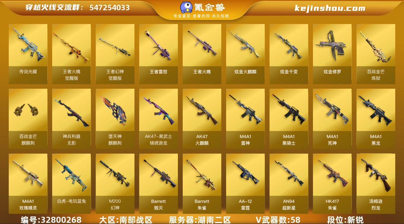 湖南二区-65V-9王者武器数-4炫金武器数 【传说武器】:传说光耀 【热门武器】:传说光耀,HK417-朱雀,M200-幻神,金色蔷薇-古蛇迷踪,修罗-古蛇迷踪,白虎-电玩蓝兔,柯尔特-冠军之特,M4A1-黑骑士*2,汤姆逊-烈龙*2,金色蔷薇-空,斯泰尔-蝴蝶,沙鹰-修罗*2,金刚伞 【王者炫金武器】:王者火魄,王者雷怒,炫金火麒麟,炫金千变,炫金修罗*2 【音效卡】:AK47-火麒麟音效卡*2,M4A1-雷神音效卡,Barrett-毁灭音效卡,白鲨语音包,炼狱-百战金芒-庆典舞曲音效卡 【皮肤】:幻神-周瑜皮肤,幻神-宠儿-2021MVP,幻神-动感闪耀 皮肤,雷神-荣耀之魄,雷神-星空,雷神-脉冲核心,M4A1-再燃火线,雷神-神秘按键 皮肤,火麒麟-冠军之心,火麒麟-华夏之心,火麒麟-平天大圣,火麒麟-白虎,火麒麟-巅峰荣耀,火麒麟-心动糖果,毁灭-荣耀之怒,毁灭-冠军之怒,毁灭-黑大圣皮肤,毁灭-英雄计划 皮肤,黑龙-能量核心,黑龙-暗月,黑骑士-冠军之势,战神-紫绶金章皮肤,AK47-B-常胜将军-曹操*2,修罗-能量核心,修罗-冠军之魂,屠龙-荣耀之锋*2,轻型军用手斧-再燃火线 【角色】:战地猎狐,王者涂鸦,蛇隐宗,乔伊教练,修道士,电竞少女,芳心审判者,嘉年华灵狐,0号玩家,灵狐者-X,...