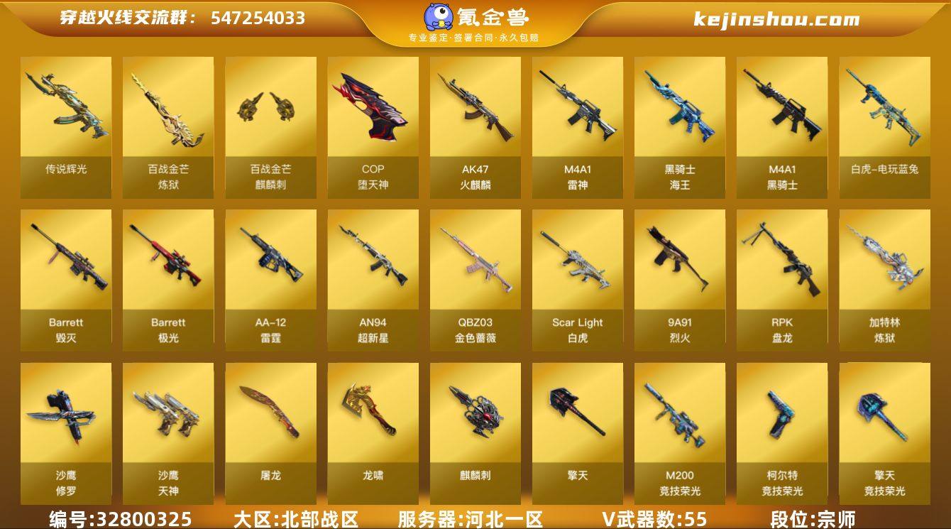 【ky6398】河北一区-55V-0王者武器数-0炫金武器数 【传说武器】:传说辉光 【热门武器】:传说辉光,QBZ03-金色蔷薇,Scar Light-白虎,金色蔷薇-古蛇迷踪,修罗-古蛇迷踪,M200-竞技荣光,白虎-电玩蓝兔,M4A1-黑骑士*3,RPK-盘龙*3,加特林-炼狱*4,COP-堕天神,沙鹰-修罗 【音效卡】:沙鹰-修罗-盛典舞曲音效卡*2,炼狱-百战金芒-庆典舞曲音效卡 【皮肤】:雷神-暗月*2,雷神-R.LGD-CFPLS18冠军,雷神-源计划2.0专属 皮肤,M4A1-再燃火线,黑骑士-破界 皮肤,无影-能量核心,炼狱-玩具枪皮肤,修罗耀金皮肤,轻型军用手斧-再燃火线,麒麟刺-月皮肤 【角色】:电竞教官-云悠悠,鹰,王者沙漠玫瑰,蛇隐宗,葵-阿尔法武装,暗夜-X,北极狐-X,初恋灵狐,电竞少女,芳心审判者,飞虎队-X,风暴女,娟娟,卡塔琳娜,0号玩家,灵狐者-X,龙儿,龙儿-小淘气,曼陀罗-X,曼陀罗-礼服,潘多拉-X,潘多拉-甜心教官,青霞仙子,蛇姬,蜀雪,铁骑荣耀,兔囡囡,维纳斯,雪莉杨-摸金校尉,夜玫瑰-宠粉,影武者-X 【人偶武器】:迷你生化手雷,生化手雷-机甲核心 【暴走生化】:超级对讲机 【挑战大师】:暴君乱世-超越Max 【英雄级武器】:AK47-火麒麟,M4A1-雷神,M4A1-黑骑士*3,AN94...