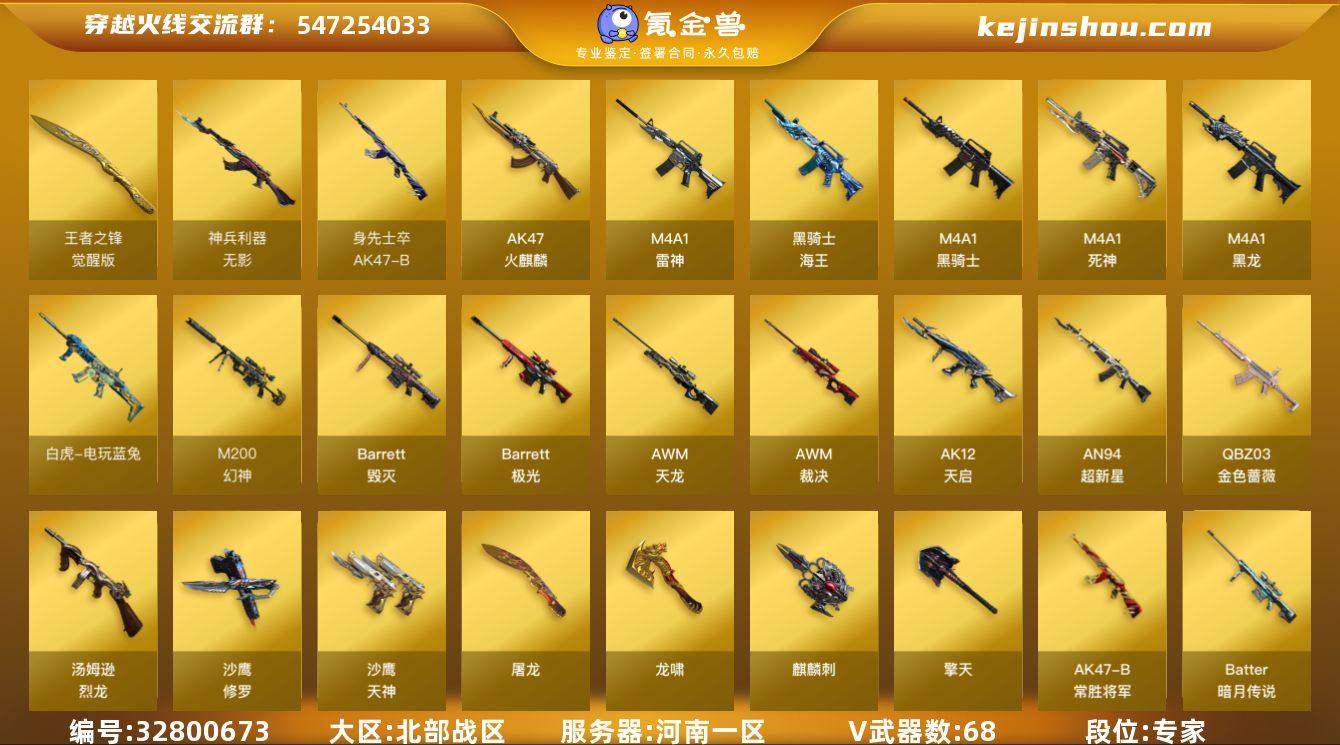 河南一区-73V-1王者武器数-0炫金武器数 【热门武器】:QBZ03-金色蔷薇,M200-幻神,白虎-电玩蓝兔,M4A1-黑骑士,汤姆逊-烈龙,USP-雷暴,沙鹰-修罗*2 【音效卡】:M4A1-黑骑士音效卡,Barrett-毁灭音效卡 【皮肤】:幻神-动感闪耀 皮肤,裁决-运输船 皮肤,裁决-胜者为王 皮肤,雷神-机甲刑天皮肤,雷神-宇航兔皮肤,火麒麟-AG战队皮肤,火麒麟-雷神,火麒麟-平天大圣*2,火麒麟-百城,火麒麟-心动糖果,毁灭-神秘黑洞皮肤,毁灭-虹光风暴 皮肤,毁灭-英雄计划 皮肤,M4A1-千变-孔明皮肤,战神-粉色甜心皮肤,战神-紫绶金章皮肤*2,AK47-B-常胜将军-孙权*2,屠龙-荣耀之锋,龙啸-青青莓果 皮肤 【角色】:战地猎狐,王者春,乔伊教练,幻面灵狐,暗夜-X,初恋灵狐,芳心审判者,风暴女,嘉年华灵狐,娟娟,兰-新年限定,灵狐者-X,灵狐者-七夕宝贝,灵狐者-职业经理,龙儿,龙儿-小淘气,麻雀,潘多拉-X,潘多拉-甜心教官,潜龙队-X,斯沃特-X,蜀雪,铁骑荣耀,兔囡囡,新娜塔莎,樱-战斗天使,影武者-X,职业选手 【人偶武器】:闪光弹-貂蝉,高爆手雷-大乔,迷你艾比,迷你超能女侍 【暴走生化】:超级对讲机 【挑战大师】:神圣爆裂者III,VEPR-12-金魔*2,激光毁灭者III...