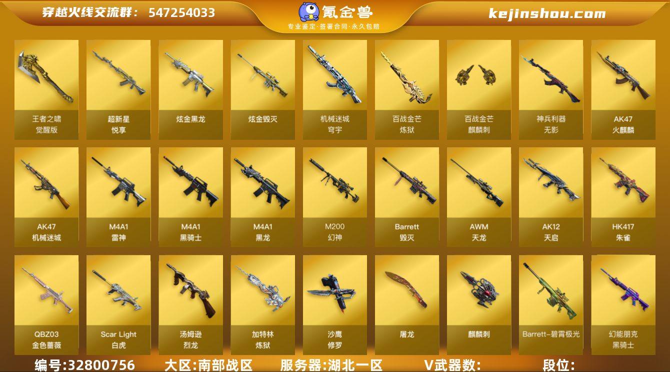 zx1480【幻神冠军三件套+白虎】【湖北一区】【可二次实名】【可排位】【荣耀枪王】【会员等级VIP3】【CF点41】【V武器数35】【幻神三件套】【幻神1皮】【M200-幻神】【幻神-冠军之幻】【M200-幻神音效卡】【Scar Light-白虎】【QBZ03-金色蔷薇】【HK417-朱雀】【加特林-炼狱】【炼狱-百战金芒】【魂·炼狱-玩具枪】【汤姆逊-烈龙】【零】【迷迭香】【M4A1-雷神】【雷神-赛博朋克】【雷神-机甲刑天皮肤】【雷神-能量核心】【雷神-暗月】【M4A1-雷神音效卡】【AK47-火麒麟】【火麒麟-平天大圣】【火麒麟-心动糖果】【火麒麟-CFSTAR】【AK47-火麒麟音效卡】【M4A1-黑骑士】【M4A1-黑龙】【Barrett-毁灭】【毁灭-星空】【毁灭-黑大圣皮肤】【Barrett-毁灭音效卡】