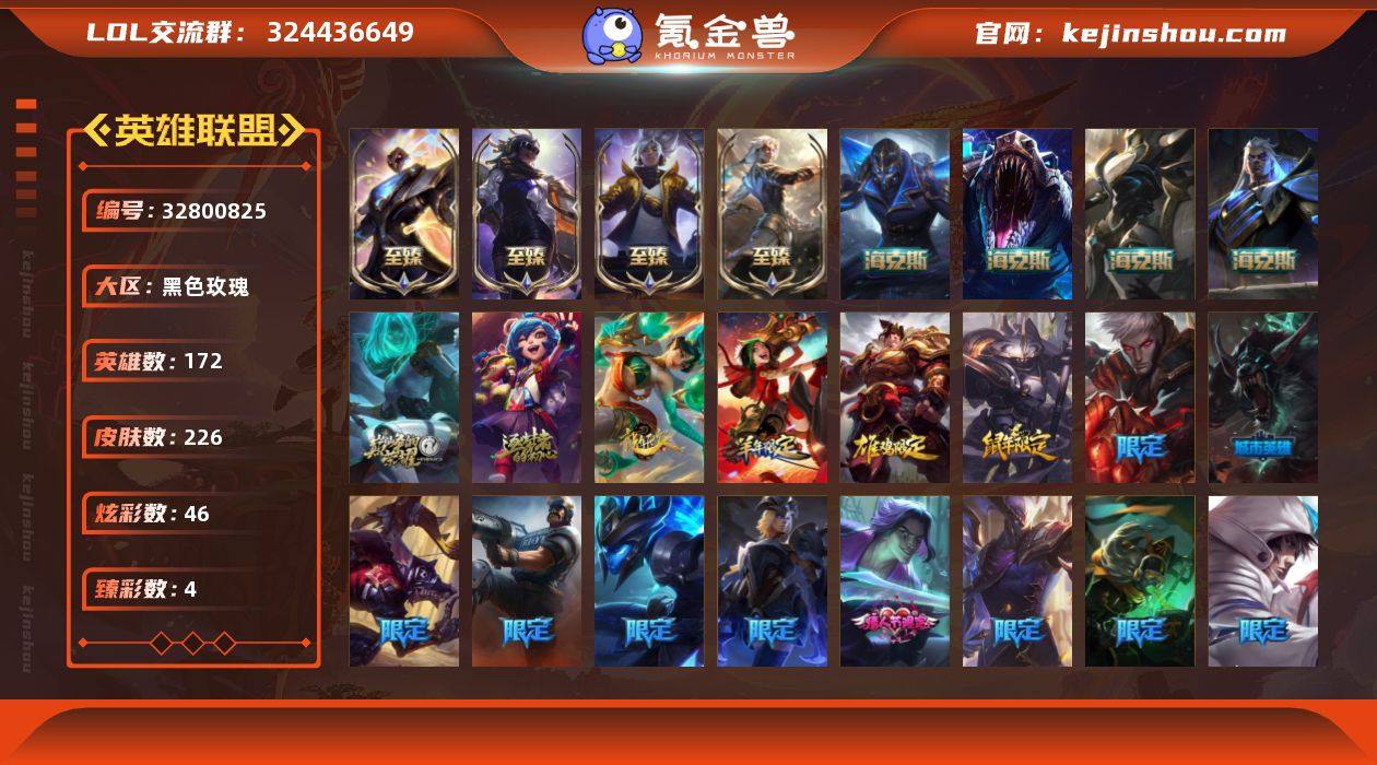 钻石段位-172英雄-226皮肤-46炫彩-0终极-11神话-30限定-31传说-41史诗 【热门头像】:银河魔装机神安妮头像 【神话皮肤】:十周年纪念安妮,源代码乐芙兰,神凰行者瑞羽圣凰艾尼维亚 【至臻皮肤】:至臻黑夜使者凯隐,至臻真实伤害亚索,至臻真实伤害赛娜,至臻未来战士锤石 【海克斯皮肤】:海克斯科技卡萨丁,海克斯科技斯维因,海克斯科技雷克顿,零之枪骑赫卡里姆 【臻彩皮肤】:无畏骑士瑟庄妮赤子初心,替父从军花木兰炫金龙刃,冠军之志瑞兹凯旋圣装,星之守护者辛德拉未来之光 【年限皮肤】:神龙烈焰金克丝,张辽文远,王国机神白虎贾克斯,天龙之子卡莎 【情人节限定】:幽梦玫瑰泰隆 【冰雪限定】:圣诞开心鬼提莫,胡桃夹子萨科,夺命美人卡特琳娜,魄罗骑士瑟庄妮 【限定皮肤】:冠军之血希瓦娜,冠军之矛卡莉丝塔,Fnatic卡尔萨斯,SSW图奇,SSW泰隆,SKTT1阿利斯塔,SKTT1艾克,iG艾瑞莉娅,iG卡蜜尔,iG卡莎,玉剑传说无影,暗裔英雄盖伦,胜利之剑亚托克斯,泳池派对嘉文四世,泳池派对普朗克,暗影沃里克,勇者阿狸,都铎王朝图奇,征服者韦鲁斯,防暴士兵格雷福斯 【传说皮肤】:地狱之门卫士加里奥,魔幻卡牌崔斯特,战地机甲厄加特,大天使长米迦勒凯尔...