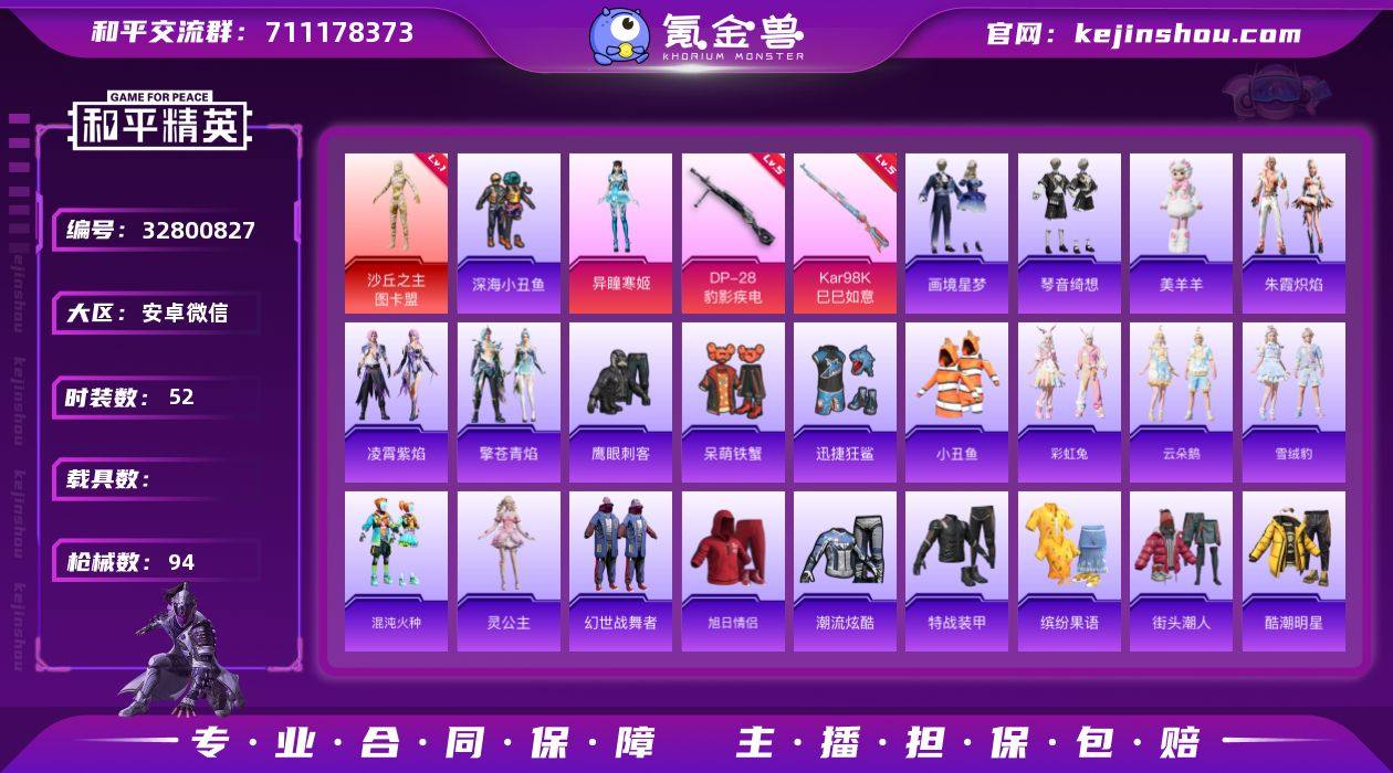 【AZH3389】安卓 微信【一级图卡盟 暮色玫影AKM】1神装-1粉装-4特效枪-0载具-3粉色飞行器-26526热力值-5王牌印记-52套装-94枪皮 【红色神装等级】:沙丘之主-图卡盟(一级) 【红色角色神装】:沙丘之主-图卡盟 【热门品类】:套装-深海小丑鱼,套装-小丑鱼 【粉色套装】:角色-异瞳寒姬 【粉色枪皮等级】:AKM-暮色玫影(三级),Kar98K-巳巳如意(五级),Mk14-福马献瑞(五级),DP-28-豹影疾电(五级) 【粉色枪皮】:AKM-暮色玫影,Kar98K-巳巳如意,Mk14-福马献瑞,DP-28-豹影疾电 【粉色飞行器】:炫彩糖果飞行器,桃源时光飞行器,暮色之舞飞行器 【粉色降落伞】:幻彩电音降落伞,双重狂想降落伞,异瞳寒姬降落伞,炫彩糖果降落伞,暮色玫影降落伞 【稀有套装】:套装-雪国风尚,套装-炫彩糖果,套装-马上有钱,套装-迅捷龙虾,套装-彩虹兔,套装-云朵鹅,套装-雪绒豹,套装-混沌火种,角色-灵公主,套装-朱霞炽焰,套装-凌霄紫焰,套装-擎苍青焰,玩偶服-美羊羊,套装-画境星梦,套装-琴音绮想,套装-雨过天青,套装-红釉青花 【稀有枪皮】:AUG-冰晶雪宝,AKM-影袭,AKM-破晓战魂,AKM-缤纷海域,AKM-龙的传人,SCAR-L-夜灯,SCAR-L-炫彩节奏,SCAR-L-红色方程式,M416-蓝色...