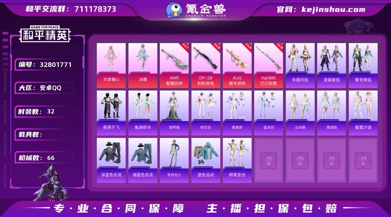 绝世印记1 【特价出售/店主推荐】 安卓 手Q-2粉装-4特效枪-18069热力值-4王牌印记-32套装-66枪皮【粉色套装】:角色-冰魄,角色-羊梦糖心【粉色枪皮等级】:AUG-暖羊咩咩(五级),Kar98K-巳巳如意(五级),AMR-智耀战神(七级),DP-28-豹影疾电(五级)