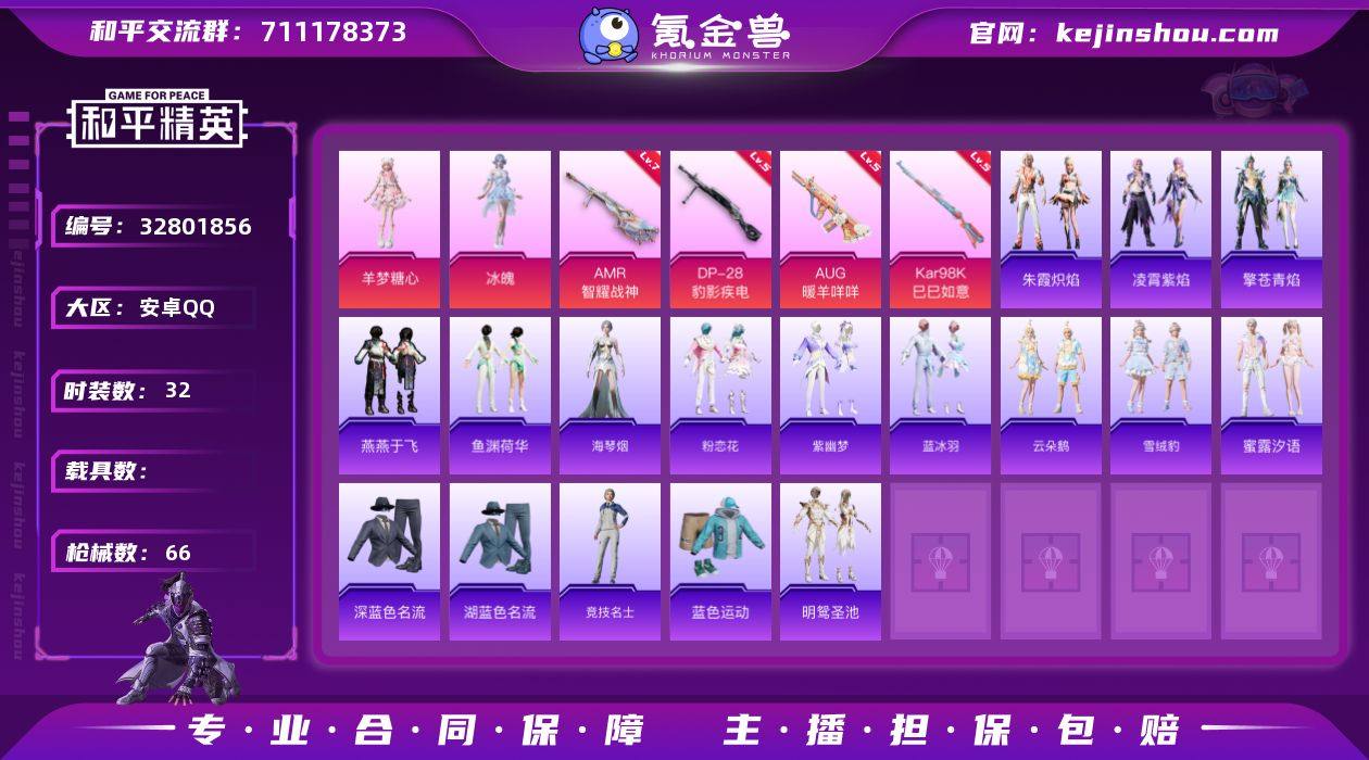 绝世印记1 【特价出售/店主推荐】 安卓 手Q-2粉装-4特效枪-18069热力值-4王牌印记-32套装-66枪皮【粉色套装】:角色-冰魄,角色-羊梦糖心【粉色枪皮等级】:AUG-暖羊咩咩(五级),Kar98K-巳巳如意(五级),AMR-智耀战神(七级),DP-28-豹影疾电(五级)