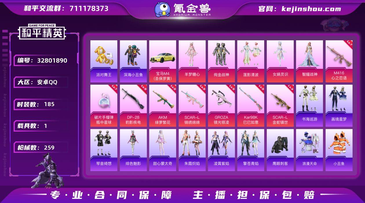 安卓 手Q-5粉装-13特效枪-1载具-3粉色飞行器-81012热力值-14王牌印记-185套装-259枪皮 【热门品类】:套装-浪漫天命,套装-派对舞王,套装-深海小丑鱼,套装-小丑鱼,角色-军刀雅典娜,套装-龟仙人,套装-暗影哥特,套装-粉红小猪,角色-Mark.06 【粉色套装】:粉装-绚金战神,粉装-莲影清波,角色-女娲灵识,角色-智耀战神,角色-羊梦糖心 【粉色枪皮等级】:AKM-绿萝繁花(五级),SCAR-L-锦绣绵绵(五级),SCAR-L-金蛇镇世(三级),M416-心之恋语(七级),GROZA-镜光银凌(五级),ACE32-萌骑漫游(四级),UMP45-萌骑冒险(二级),AKS-74U-森灵之息(五级),Kar98K-巳巳如意(五级),Mk14-福马献瑞(五级),AA12-G-萌骑幻想(三级),DP-28-豹影疾电(五级),破片手榴弹-瓶中星球(七级) 【粉色载具】:宝马M4(圣保罗黄) 【粉色枪皮】:AKM-绿萝繁花,SCAR-L-锦绣绵绵,SCAR-L-金蛇镇世,M416-心之恋语,GROZA-镜光银凌,ACE32-萌骑漫游,UMP45-萌骑冒险,AKS-74U-森灵之息,Kar98K-巳巳如意,Mk14-福马献瑞,AA12-G-萌骑幻想,DP-28-豹影疾电,破片手榴弹-瓶中星球 【粉色飞行器】:绝对恒星飞行器,炫彩糖果飞行器,圣域金龙飞行器 【粉色降落伞】:绝对恒星降落伞,齐天大圣降落伞,环...