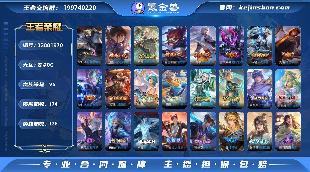 账号亮点:云缨神骥越千峰,后羿神树通天,马超无双飞将,刘备时之恋人,百里玄策白虎志,李白凤求凰,宫本武藏地狱之眼,狄仁杰超时空战士 孙悟空至尊宝273-25 【英雄全皮】:孙权全皮 【传说皮肤】:云缨神骥越千峰,后羿神树通天,马超无双飞将,刘备时之恋人,百里玄策白虎志,李白凤求凰,宫本武藏地狱之眼,狄仁杰超时空战士 【限定皮肤】:暃埋骨钱,蒙犽顽岩魄,虞姬夏日便利店,姜子牙天穹之誓,狄仁杰阴阳师,赵云皇家上将,孙尚香蔷薇恋人,高渐离玩趣恶龙,狄仁杰魔术师,狄仁杰万华元夜,达摩沙漠行僧,项羽海滩派对,老夫子醍醐杖,程咬金演武夺筹,兰陵王金庭之子,孙悟空至尊宝,李元芳云中旅人,钟馗驱傩正仪,鬼谷子原初探秘者,鬼谷子五谷丰年,百里玄策白虎志,梦奇顽趣,沈梦溪大漠名商,明世隐疑决卦,裴擒虎李小龙,裴擒虎擒涛扼浪,鲁班大师探海日志,桑启海盐诗旅,艾琳女武神,赵怀真鹤归松栖,张良古海寻踪,蒙恬荣光圣徽,鬼谷子天穹祈灯,沈梦溪龙舞盛年,刘邦剑破天穹,程咬金群星魔术团,周瑜熔金海岸 【年限皮肤】:李白凤求凰,百里玄策白虎志 【赛季限定】:明世隐疑决卦,老夫子醍醐杖,鬼谷子原初探秘者,狄仁杰万华元夜,程咬金演武夺筹...